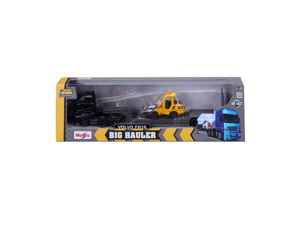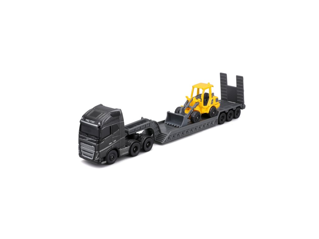 Volvo FH16, Volvo L25H Wheel Loader with Bucket. Velký a silný tahač, který veze mini verzi pracovního stroje. Kovové autícko s plastovými detaily a opravdovými gumovými pneumatikami. Balení: 27,5x8x4,8cm. Věk: 8+
