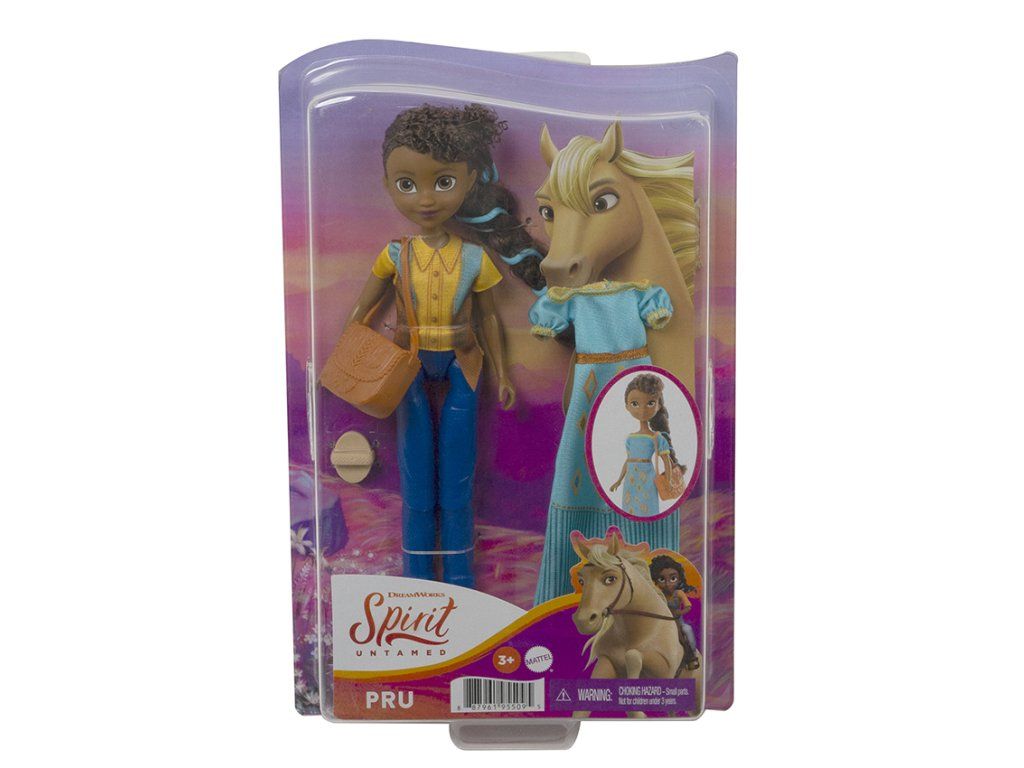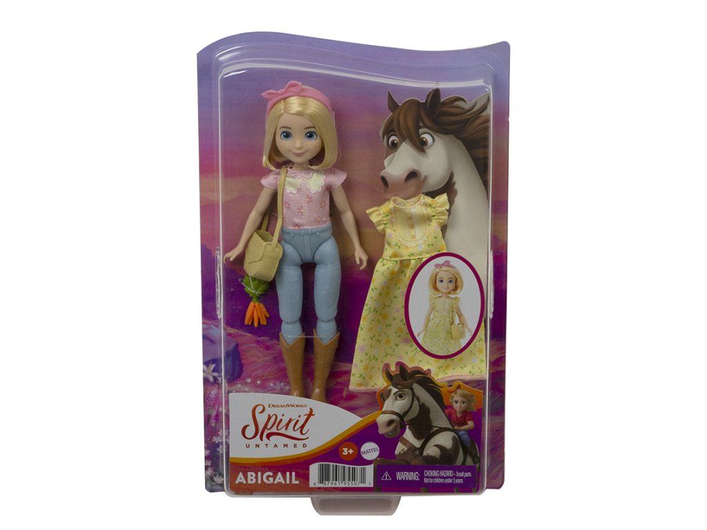 Buďte součástí všeho toho přátelství, statečnosti a dobrodružství s animovaným filmem Spirit od DreamWorks! Sortiment panenek a módních doplňků Spirit Happy Trails Doll & Fashion nabízí výběr z panenek Štístko, Abigail nebo Pru, každé oblečené v roztomilém typickém oblečení. Každá panenka je dodávána i s dalšími šaty, kabelkou a doplňky. Panenky jsou velké přibližně 17,78 cm a jsou vybaveny 7 pohyblivými klouby pro zábavu při pózování a hraní. Každá se prodává samostatně, v závislosti na dostupnosti. Barvy a dekorace se mohou lišit.