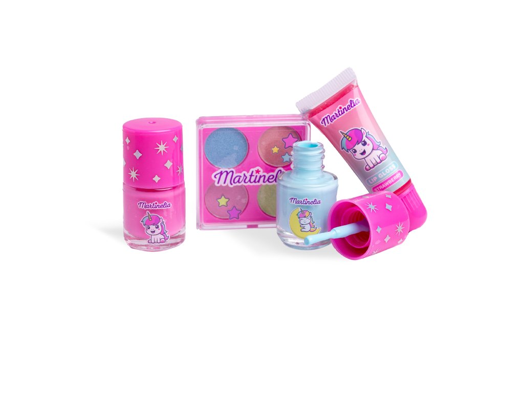 MARTINELIA Little unicorn Sada dekorativní kosmetiky. Obsahuje: 1x paletka očních stínů - 4 barvy, 2x lak na nehty, 1x lesk na rty. Pro odstranění laku na nehty použijte teplou vodu a mýdlo, poté lak lehce sloupnete. Šetrné pro dětské nehty, není potřeba použít odlakovač na nehty.
