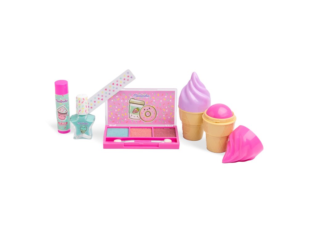 MARTINELIA Yummy lips & nails Sada dekorativní kosmetiky. Obsahuje: 1x paletka očních stínů - 3 barvy a aplikátor, 2x lesk na rty, 1x balzám na rty, 1x lak na nehty a samolepky na nehty. Pro odstranění laku na nehty použijte teplou vodu a mýdlo, poté lak lehce sloupnete. Šetrné pro dětské nehty, není potřeba použít odlakovač na nehty.