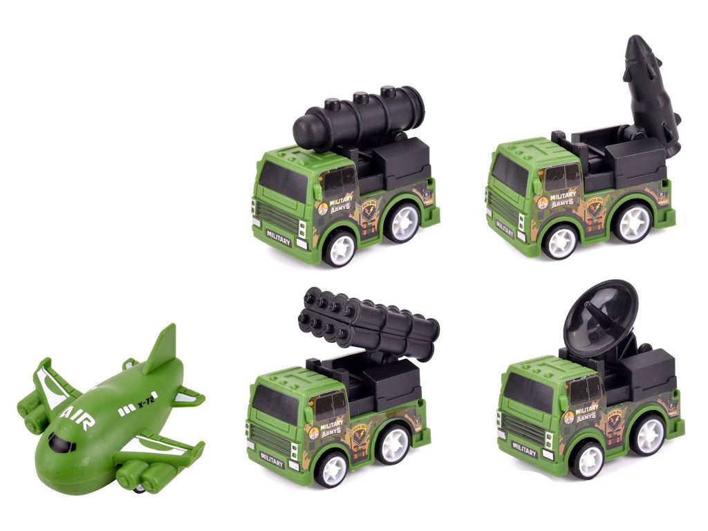 Vojenský technika 5 ks. Velikost dopravních prostředků 5,5 cm. Na zpětné natažení.