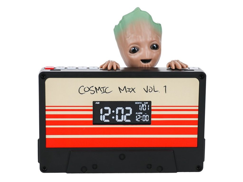 Oficiální produkt - digitální stolní budík z katalogu výrobků s grafikou a licencí populární fiktivní postavy jménem Groot od společnosti Marvel.