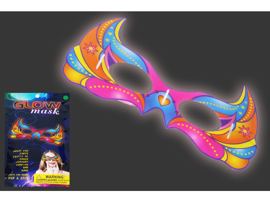 Svítící maska Obsahuje: svítící tyčinky, masku, provázek 6 různých barev.