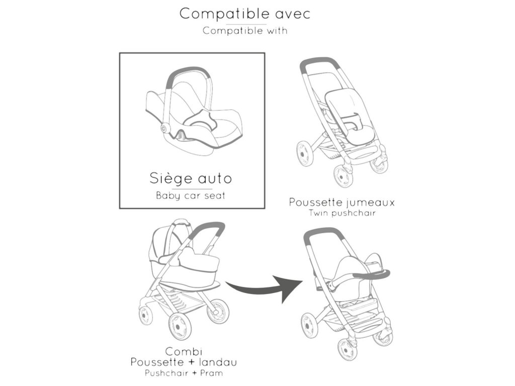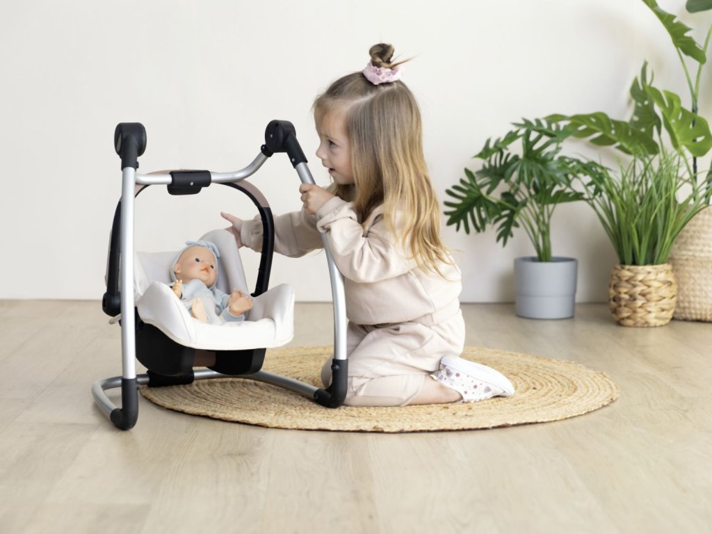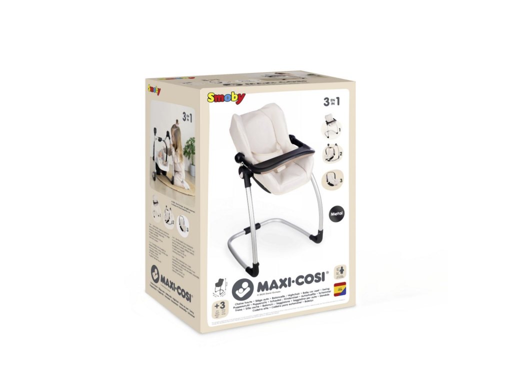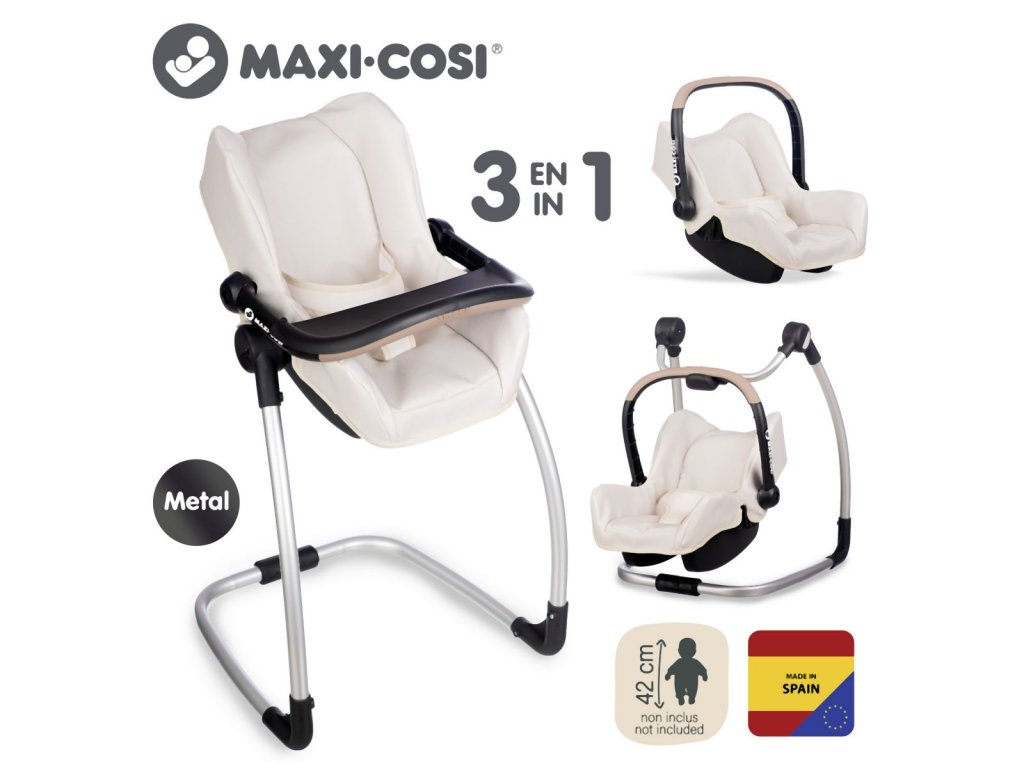 Autosedačka Maxi-Cosi 3 v 1 pro panenky. Při zavěšení sedačky na konstrukci je rázem houpačka pro panenku do velikosti 42 cm. Otočením konstrukce získáte vysokou jídelní židličku s pultíkem. Rozměry (DxŠxV): 43 x 41 x 72 cm.