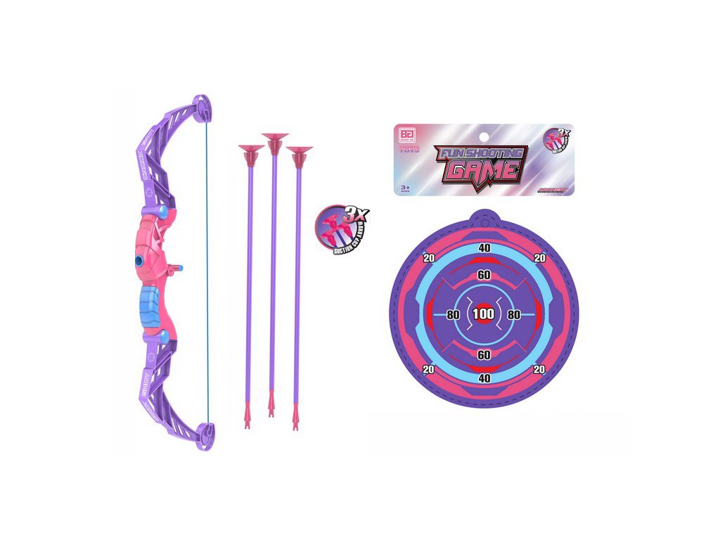 Luk se šípy a terčem fialový. Součástí luk, 3 šípy, terč. Délka luku 57 cm, průměr terče 18 cm.