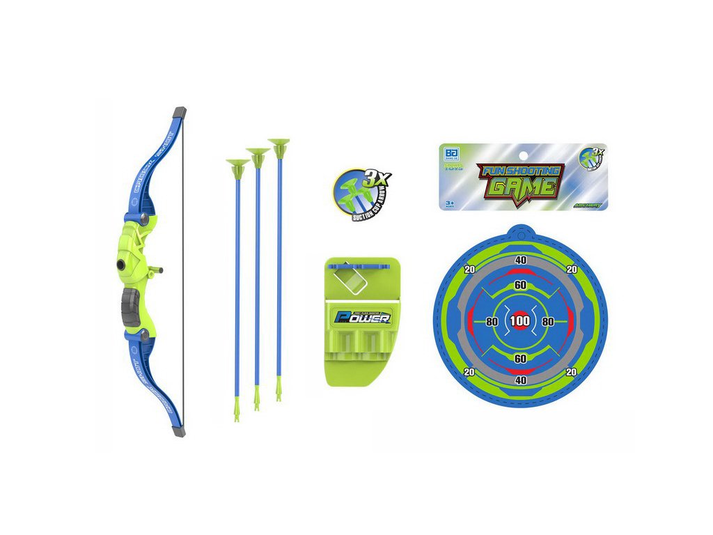 Luk se šípy a terčem. Součástí luk, 3 šípy, pouzdro na šípy, terč. Délka luku 57 cm, průměr terče 18 cm.