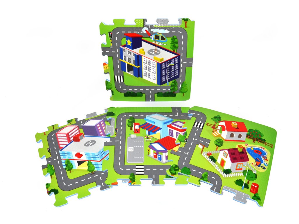 Postavte dětem město v podobě pěnového koberce - puzzle o velikosti 92 x 92 cm. Děti si užijí si spoustu zábavy a navíc na bezpečném měkkém místě. Skládá se ze 9 bloků o velikosti 32 x 32 cm.