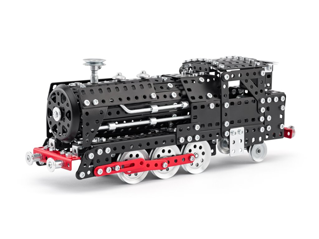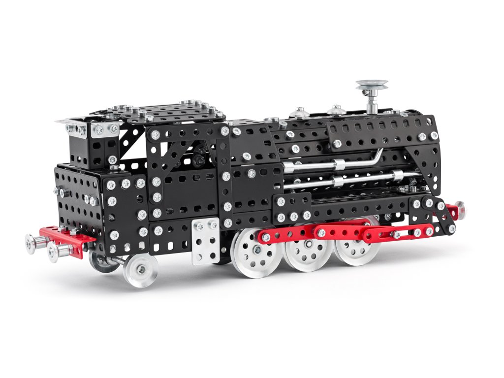 Kovový model v ikonické černé barvě s červenými prvky. Pohyblivá kola a spojnice. Kabina strojvedoucího, detaily parních trubek, komín, písty, přední reflektory, spřáhla..V balení najdete podrobný návod. Merkur díly jsou univerzální a tak vás neomezí v jakékoli modifikaci a nápadu. Stavebnici tak můžete sestavit podle přiloženého návodu nebo čistě podle svých představ. Se sestavenými modely si lze hrát, jsou velmi odolné. Podporuje a rozvíjí manuálních schopnosti, logické myšlení, soustředění. Rozměr balení: 33x22,5x5,5 cm. Počet dílků: 596 ks. Věk: 8+