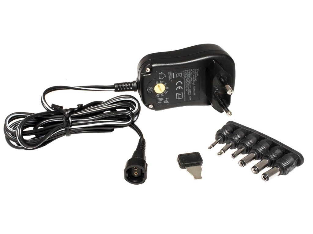 Univerzální napájecí zdroj. Popis zdroje: Stabilizovaný spínaný napájecí síťový adaptér. Technické parametry: Výstup: Stabilizovaný Výstupní napětí: 3 / 4,5/ 6 / 7,5/ 9 / 12 V DC Výstupní výkon: 12,5 W Výstupní konektor: Sada výměnných konektorů Typ: Spínaný Vstupní napětí: 100-240 V AC/ 50 Hz Provedení: Síťová vidlice