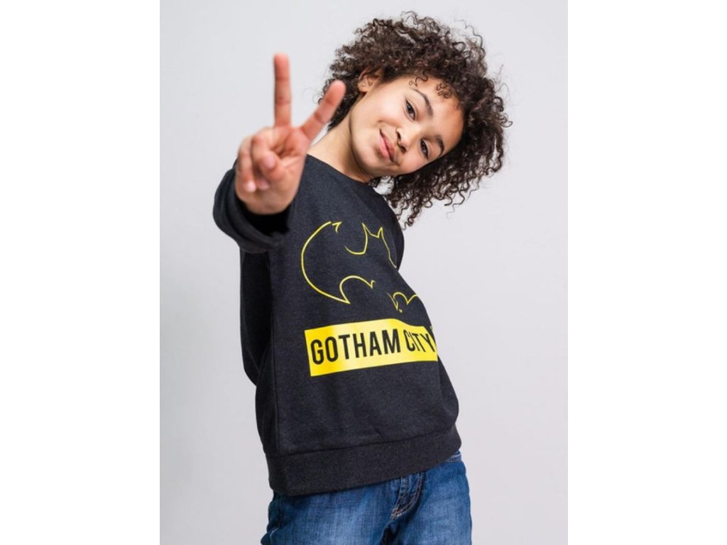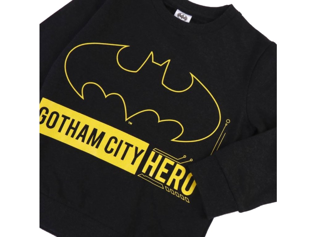 Černá dětská mikina bez kapuce s grafikou žlutého symbolu netopýra superhrdiny Batmana a nápisem: Gotham City Hero'' (Hrdina města Gotham). Mikina je vhodným dárkem pro všechny malé superhrdiny, kteří ale mají velké srdce na záchranu města.