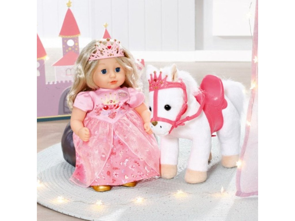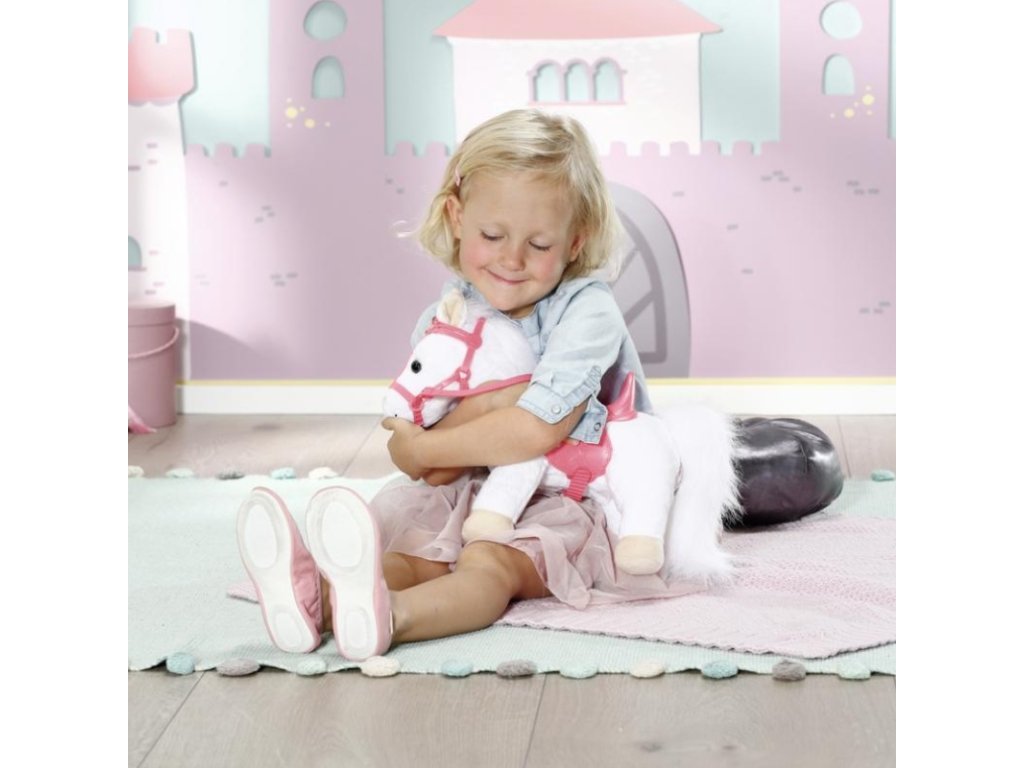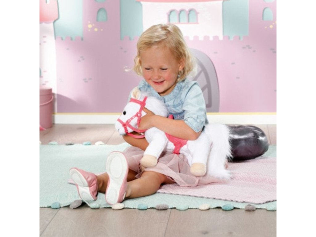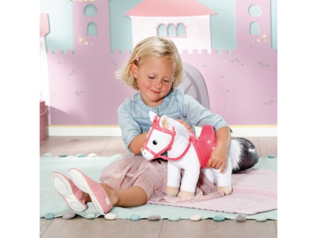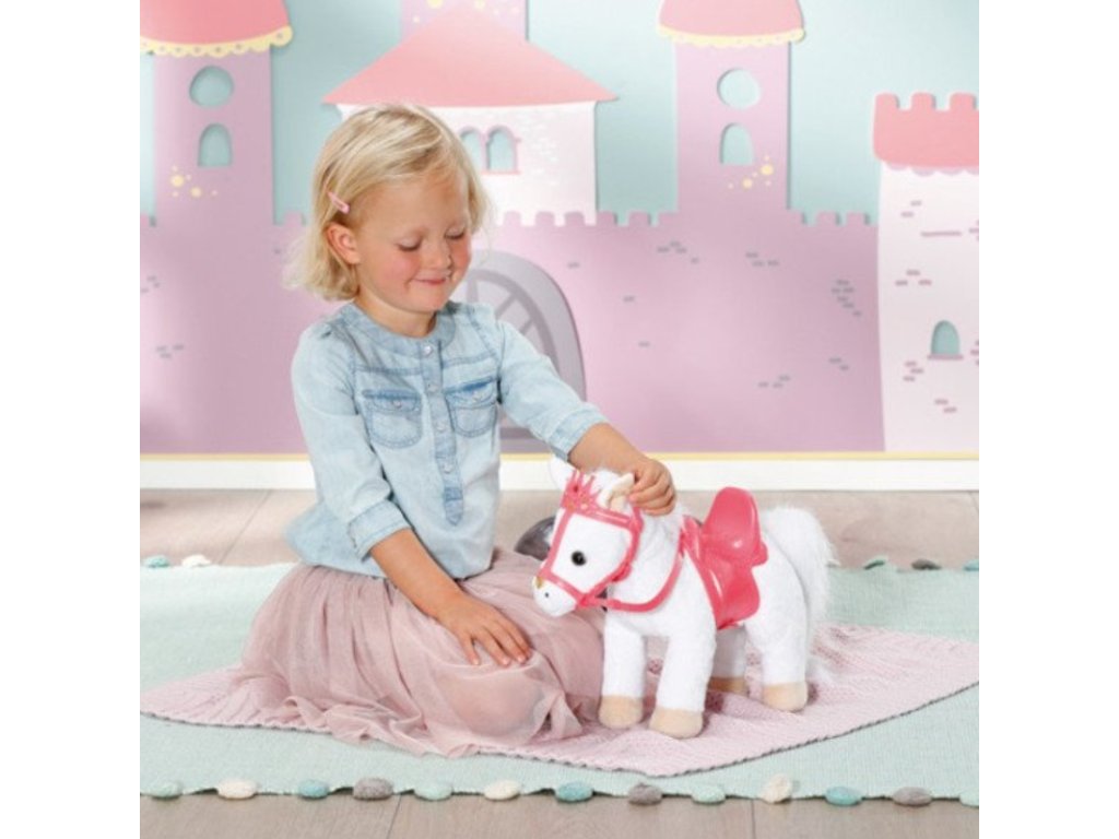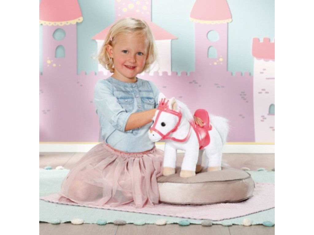Bílý poníček má královskou uzdu se třpytivou korunkou. Za ní má poník pozorně nastražená legrační ouška. Po stisknutí pravého ouška poník zařehtá nebo zafuní. Po stisknutí levého ouška uslyšíte klapot kopyt. Panenka Baby Annabell Little je zamilovaná do svého zvířecího miláčka a často mu dává pusinku na čumáček. Poník odpovídá zvukem polibku. Malá princezna při vyjížďce sedí pohodlně v sedle. Perfektně formované jezdecké sedlo zajistí, že v něm má panenka při jízdě potřebnou stabilitu.