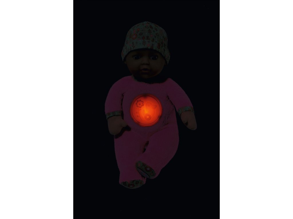 Díky rozkošné panence „Svítí ve tmě“ se z usínání stane dětská hra. Látkovou panenku velikosti 30 cm můžete umístit do kolébky nebo do dětské postýlky těch nejmenších dětiček už od narození. Má měkké tělíčko a rozkošné plyšové dupačky. Stisknutím kolečka na bříšku se aktivuje noční světýlko a rozezní se uklidňující melodie. Měkkou vinylovou hlavičku panenky chrání čepička s roztomilým potiskem. Různé textury materiálů na panence povzbuzují malé děti k hraní a objevování. A když se děti rozhodnou ručičku nebo nožičku panenky použít jako kousací kroužek, panenka se dá jednoduše vyprat v ruce, stačí z ní jen vyjmout zvukový modul.