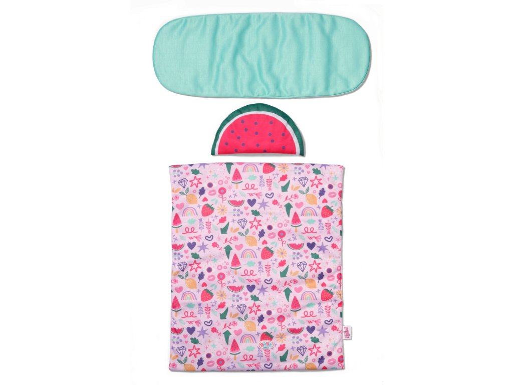 • Kompletní sada lůžkovin: Měkký polštářek ve tvaru melounu, měkká přikrývka s motivy ovoce a matrace.