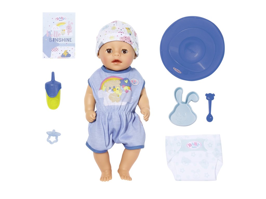 "„Ale ne, proč jsi hodil lžící přes celou místnost?“ I když se chlapeček moc snaží trénovat se svým talířkem ve tvaru zajíčka, sám zatím ještě jíst nedokáže. Někdy ho to tak mrzí, že se dokonce rozpláče. Když ale dostane svoji lahvičku, hned je vše zapomenuto. Ti, kteří hodně pijí, potřebují i hodně na nočníček nebo se počůrají do plenky. Chlapeček BABY born Little moc rád cvičí miminkovskou gymnastiku. Modrý overálek, který má na sobě, nikde neškrtí ani nepřekáží a je na cvičení jako dělaný. Malá maminka chlapečkovi zvedá ruce, procvičuje nožky nebo mu otáčí hlavu ze strany na stranu. Po hodině gymnastiky se miminko musí vykoupat a pak už může jít spinkat. Zavře modrá očka a nechá si zdát o krásném dni, který právě prožilo.
