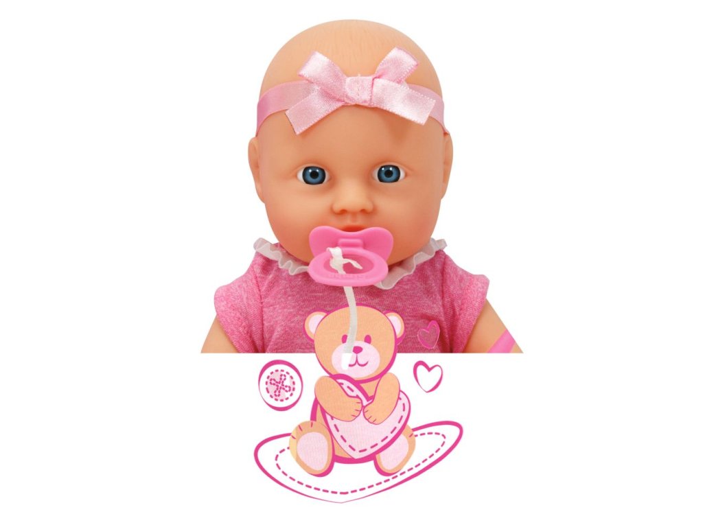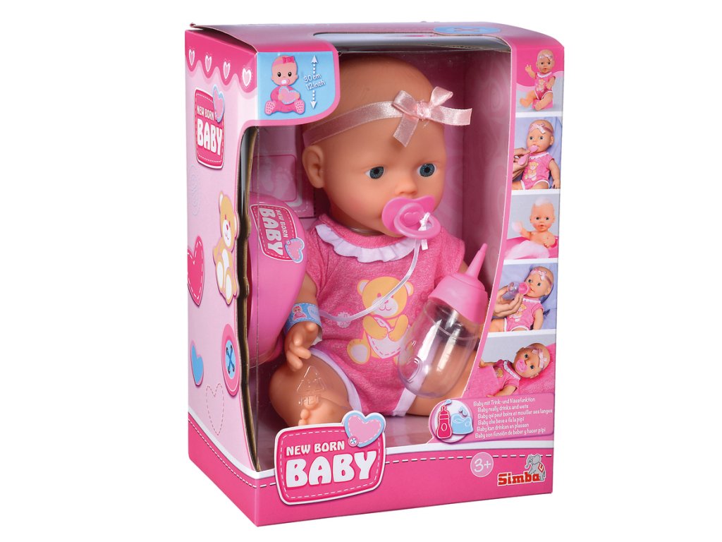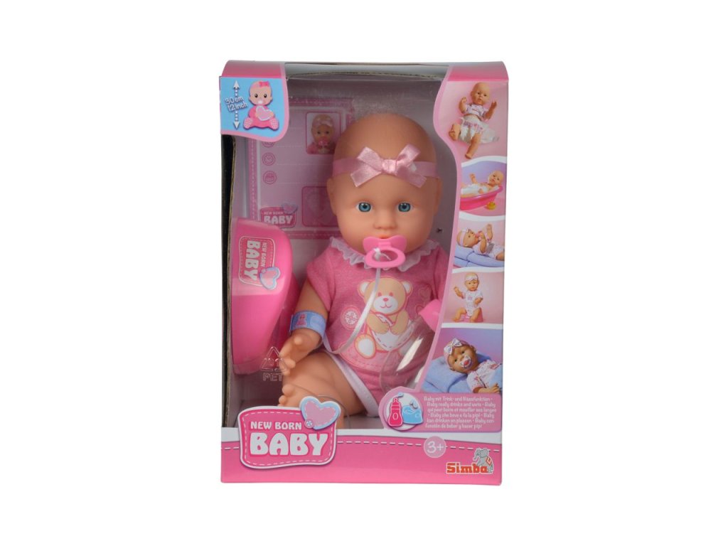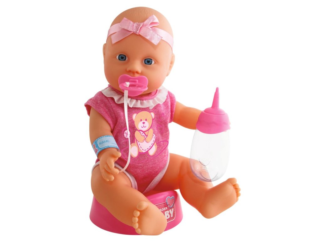 Panenka s plastovým tělíčkem z řady New Born Baby s funkcí "pije a čůrá". Součástí 4 ks příslušenství: dudlík, lahvička, nočník a rodný list. Velikost panenky 30 cm.