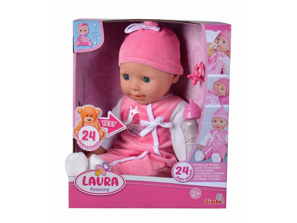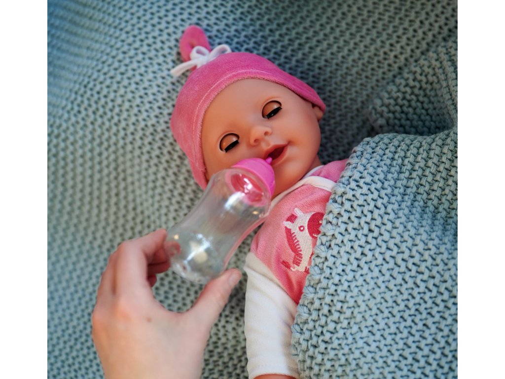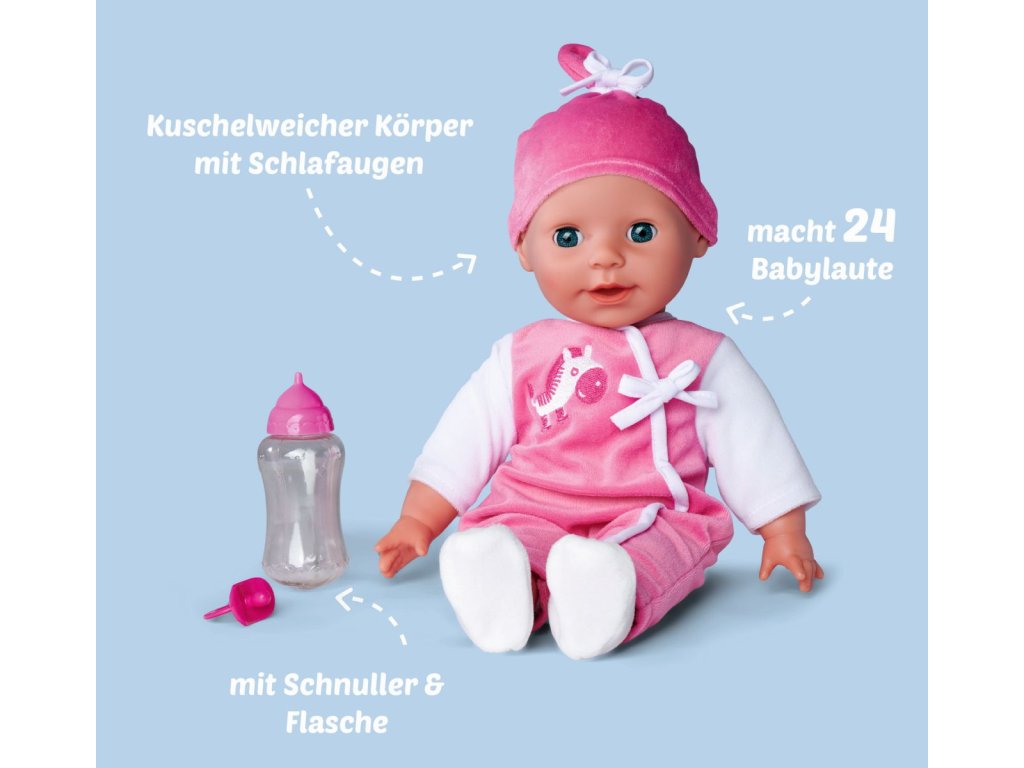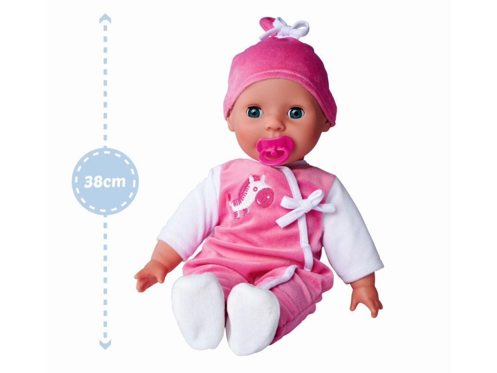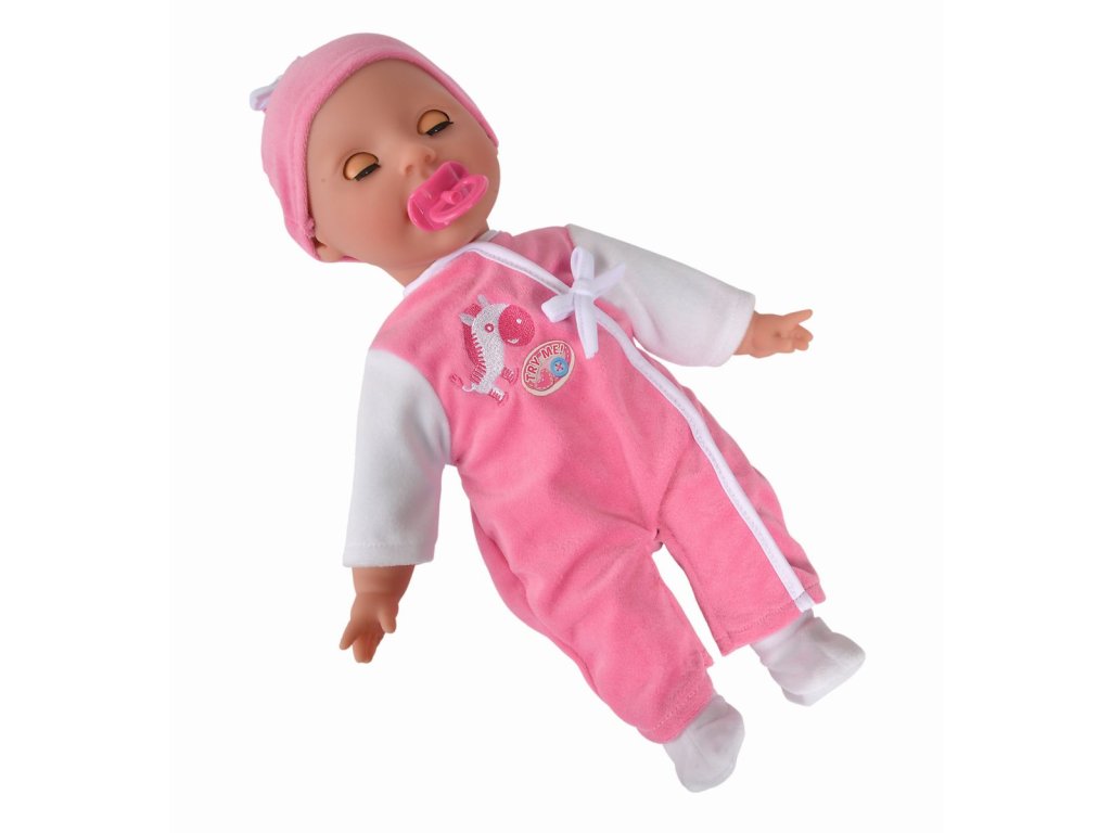 Panenka miminko s měkkým tělem a se spícíma očima v roztomilém overalu, 24 dětských zvuků. Velikost 38 cm.