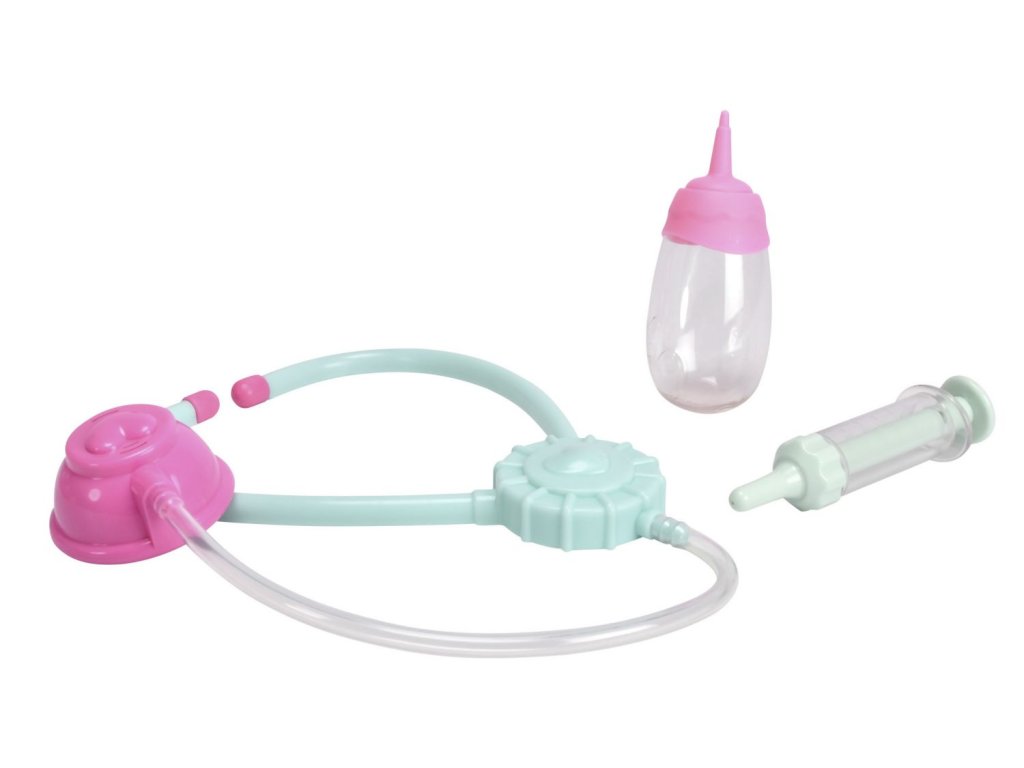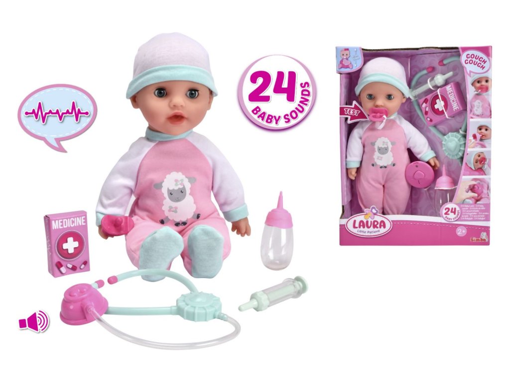 Panenka Laura s měkkým tělíčkem, několika funkcemi a s doktorským příslušenstvím. Výška panenky 30 cm.