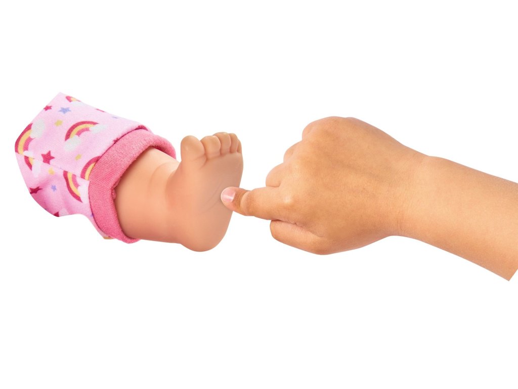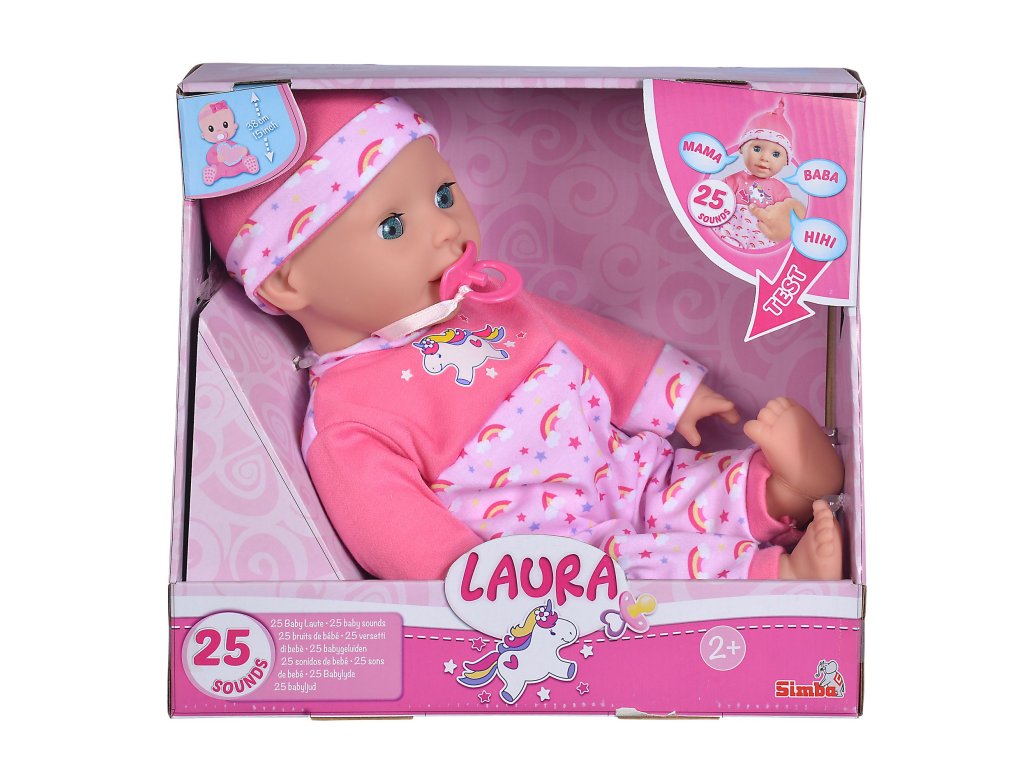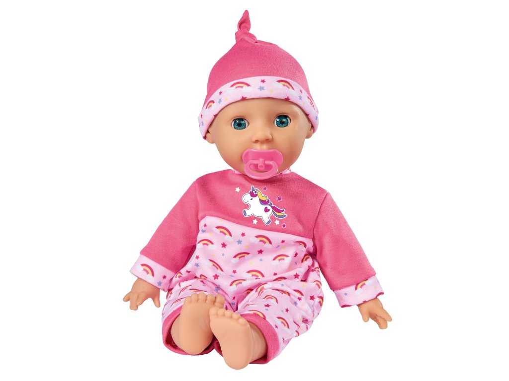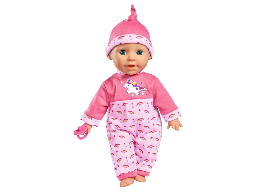 Panenka s měkkým tělíčkem, s 25 dětskými zvuky jako „mama“, „baba“, "hihi“ a mnoha dalšími, s dudlíkem, mrkacíma očima. Výška panenky 38 cm.