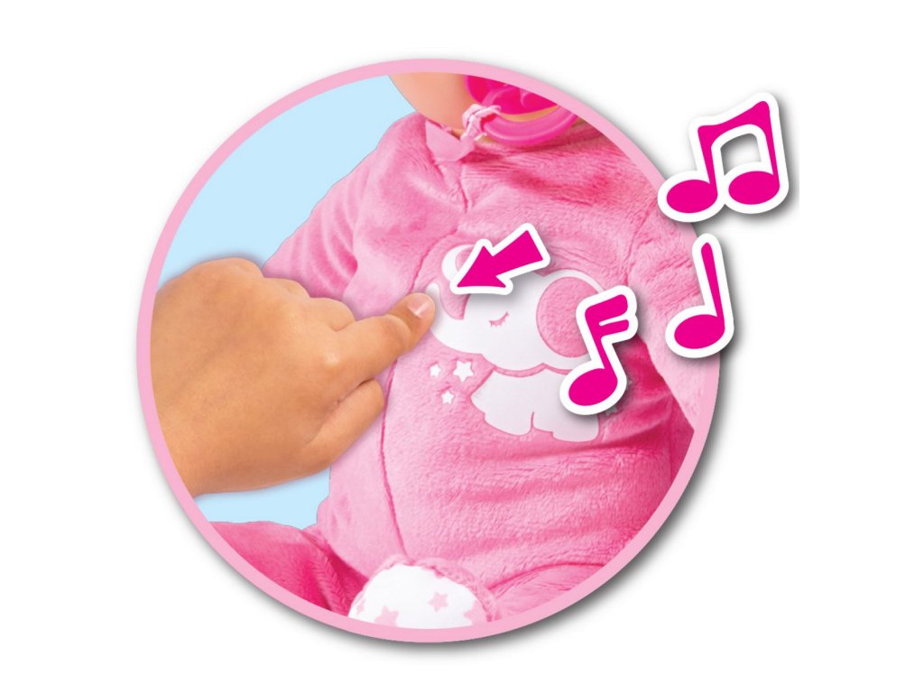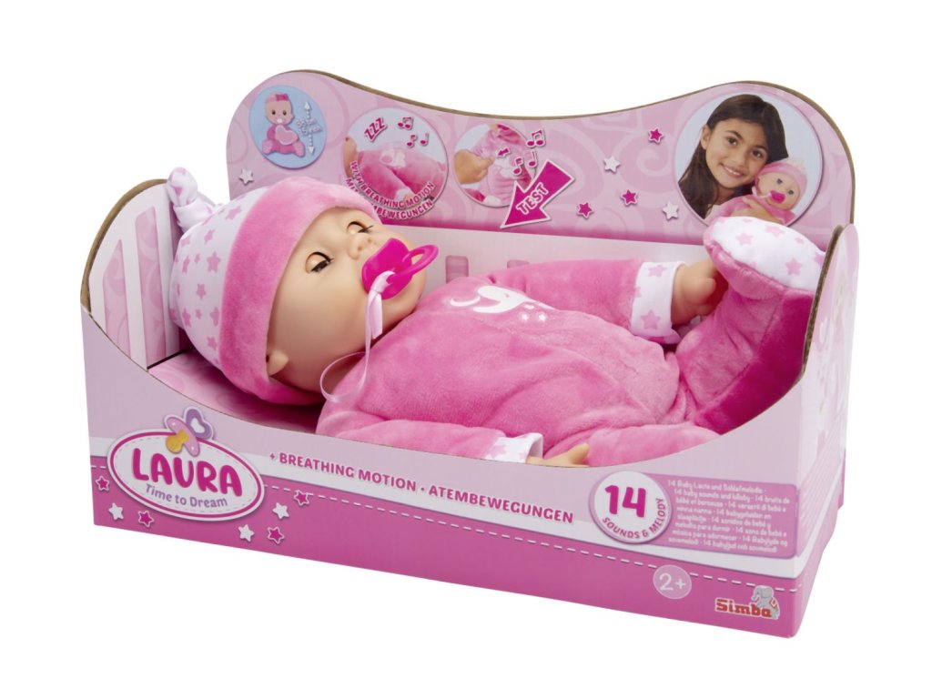 Měkká panenka Laura Time to Dream má mnoho funkcí: umí zavřít oči, při usínání s dudlíkem umí hrát melodii uklidňující ukolébavky a po jemném stisknutí bříška vydává celkem 14 různých zvuků. To nejlepší ale je, že opravdu dýchá. Když usíná, její bříško se skutečně pohybuje nahoru a dolů. Dobrou noc, Lauro, sladké sny. Velikost panenky 38 cm.