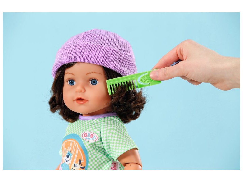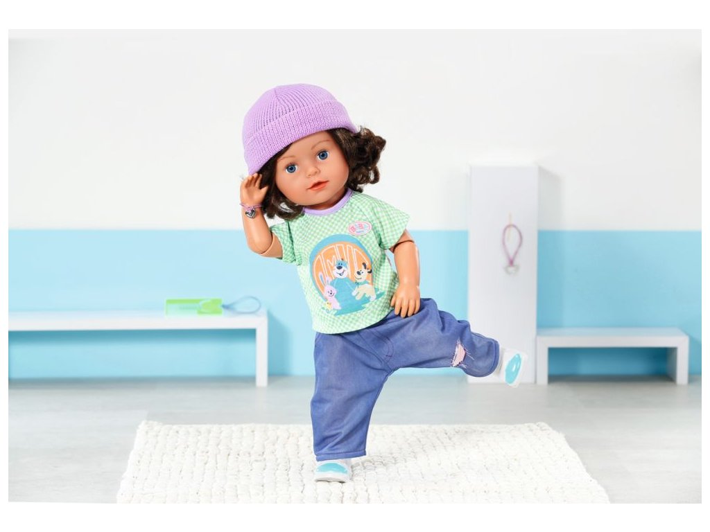 Starší bratříček BABY born Play & Style, 43 cm je oblečen do trička, kalhot, bot a čepice. Součástí balení je hřeben na vlasy a 2 náramky přátelství – pro panenku a její malou maminku.
