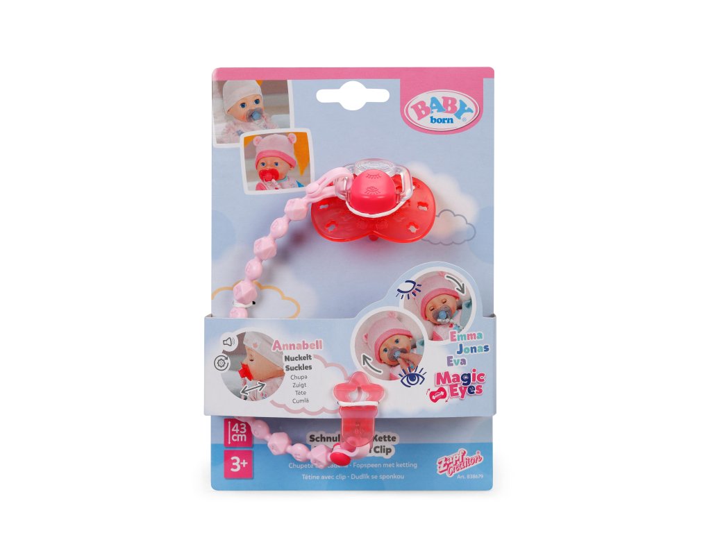 Kouzelný dudlík činí hru na rodiče ještě realističtější a interaktivnější! Díky speciální funkci panenky Annabell, Alexander, Emma, Eva, Jonas a Leah reagují na dudlík jako opravdová miminka. Zatímco Annabell a Alexander mají díky dudlíku sací reflexy, Emma, Eva a Jonas při otáčení dudlíku zavírají oči a klidně usínají. To dělá večerní uspávání zvlášť láskyplným a zajišťuje realistické hraní. Perfektní pro malé „rodiče“ panenek, kteří se chtějí starat o své panenky velikosti 43 cm.