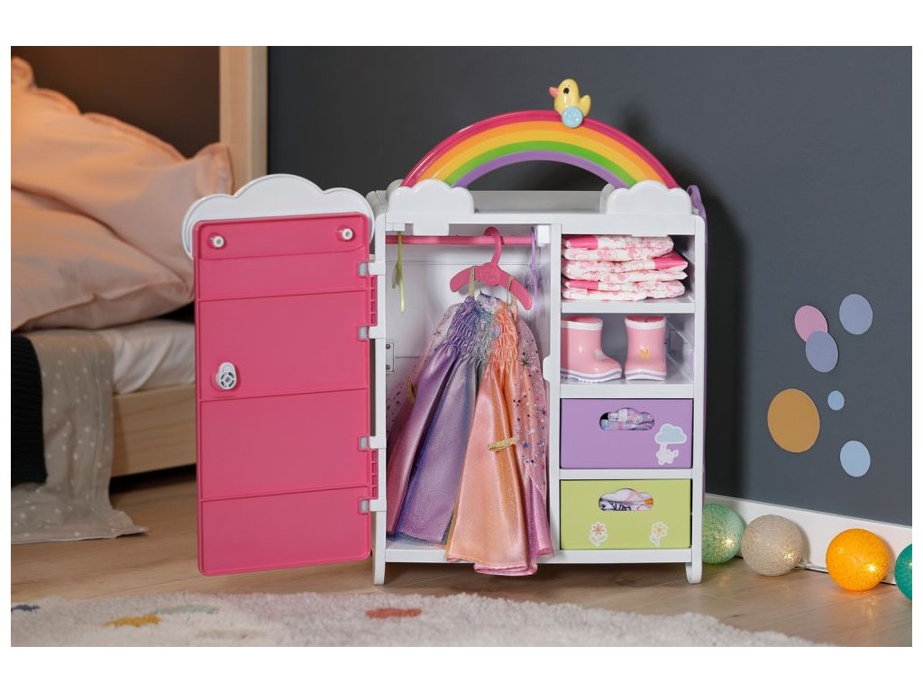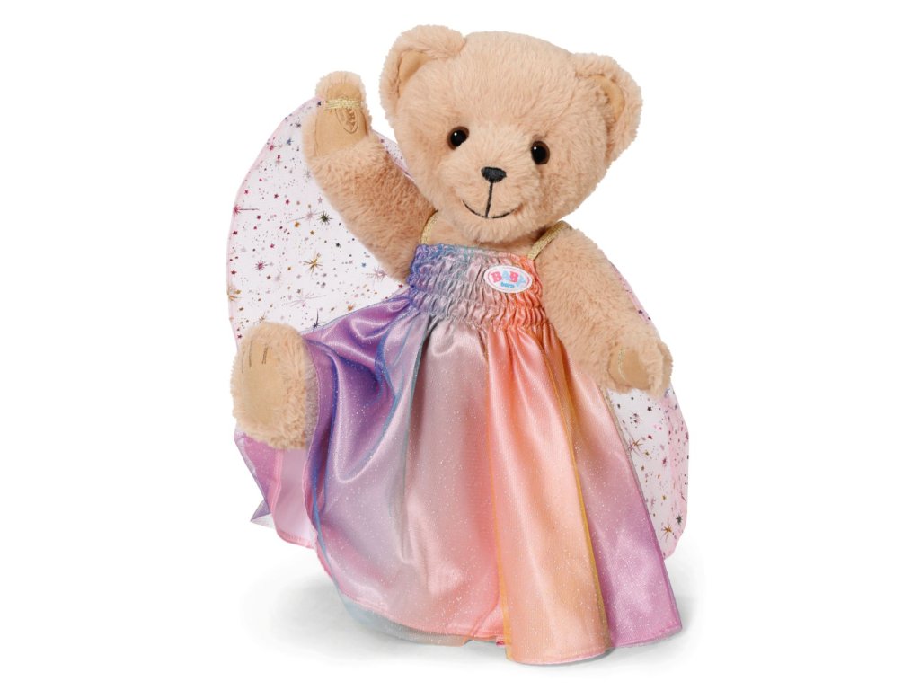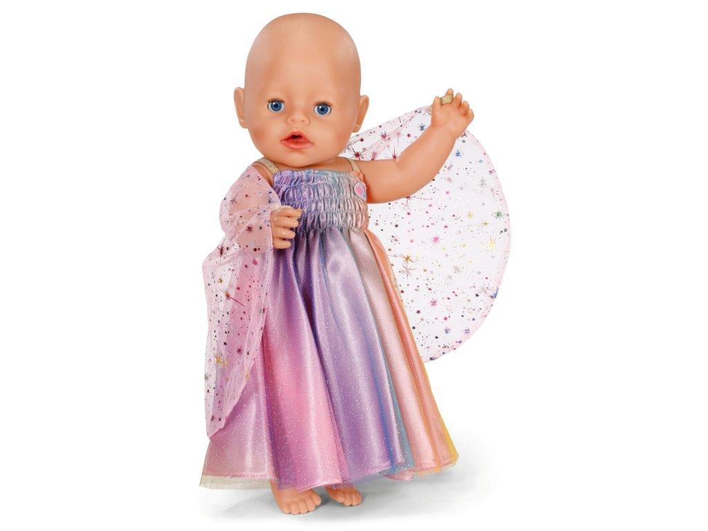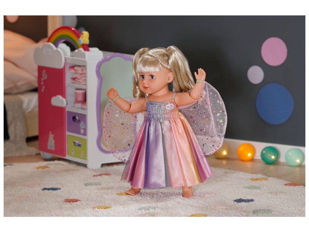 Nápadité duhové šatičky vybízejí ke snění: s našitými křidélky se BABY born vznáší dnem jako víla. Aby mohla mávat křidélky, mají šatičky našitá malá poutka na ruce. Šatičky se třpytí všemi barvami duhy.