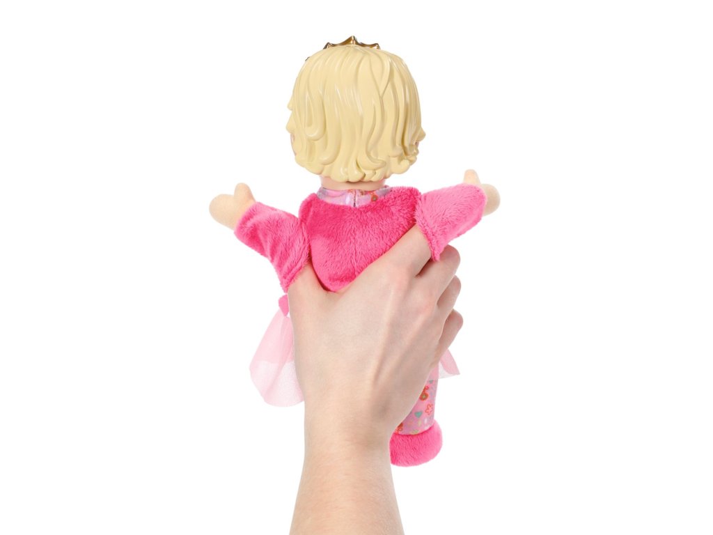 Tahle princeznička přinese do dětských pokojíčků kouzelné chvíle. Panenka – maňásek obživne, jakmile vsunete prsty do malých kapsiček na pažích panenky. Měkká vinylová hlavička se zlatou korunkou dodává panence královský vzhled a měkce vycpané tělíčko je ideální k pomazlení. Roztomilý top panenky zdobí výšivka zaječí princezny.