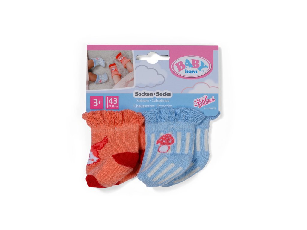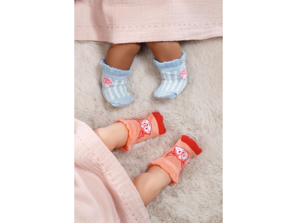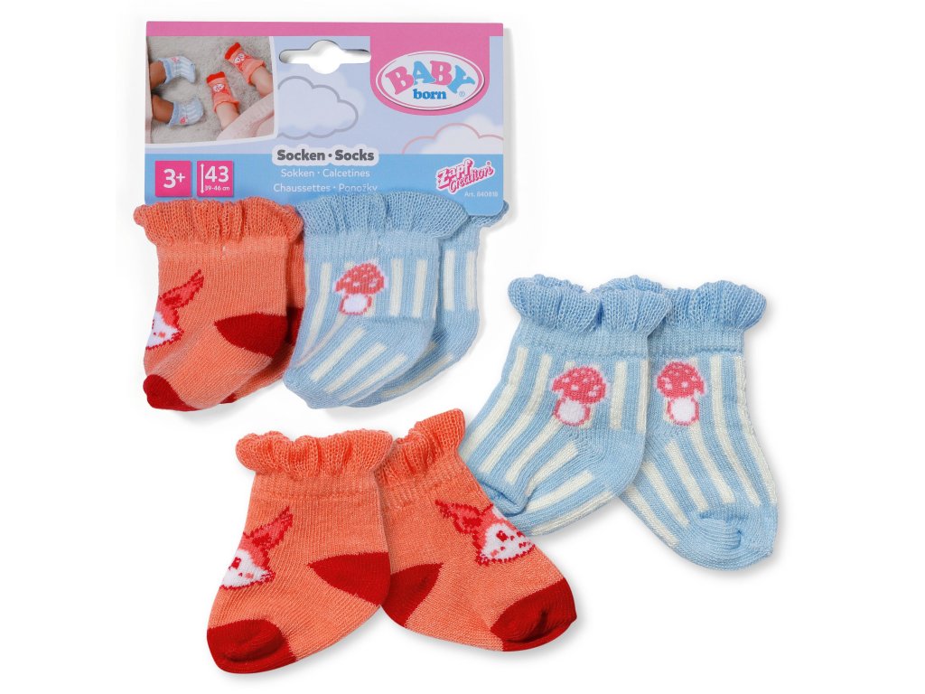 Nohy hezky v teple je základ i pro panenku. Ponožky pro BABY born jsou krásně měkké a příjemné. A protože jsou k tomu i krásně barevné, je to dvojnásobná výhra. Vybírat je možné ze dvou kombinací. V první najdete jedny ponožky růžové, které jsou ozdobené bílými puntíky a ovečkou a druhé ponožky bílé, na kterých poletuje motýlek mezi růžovými obláčky. Druhá dvojice kombinuje oranžové ponožky s obrázkem lištičky a bílo-modré pruhované s muchomůrkou. Ponožky se snadno oblékají a jsou ideální pro kombinování se všemi kousky oblečení BABY born.