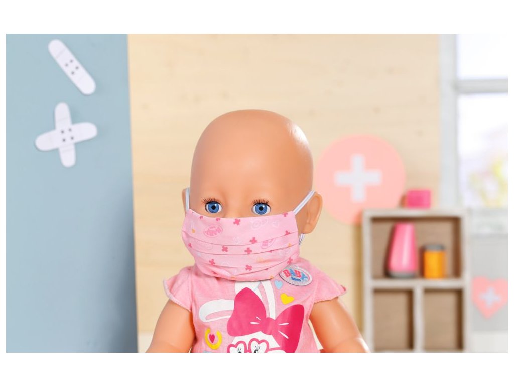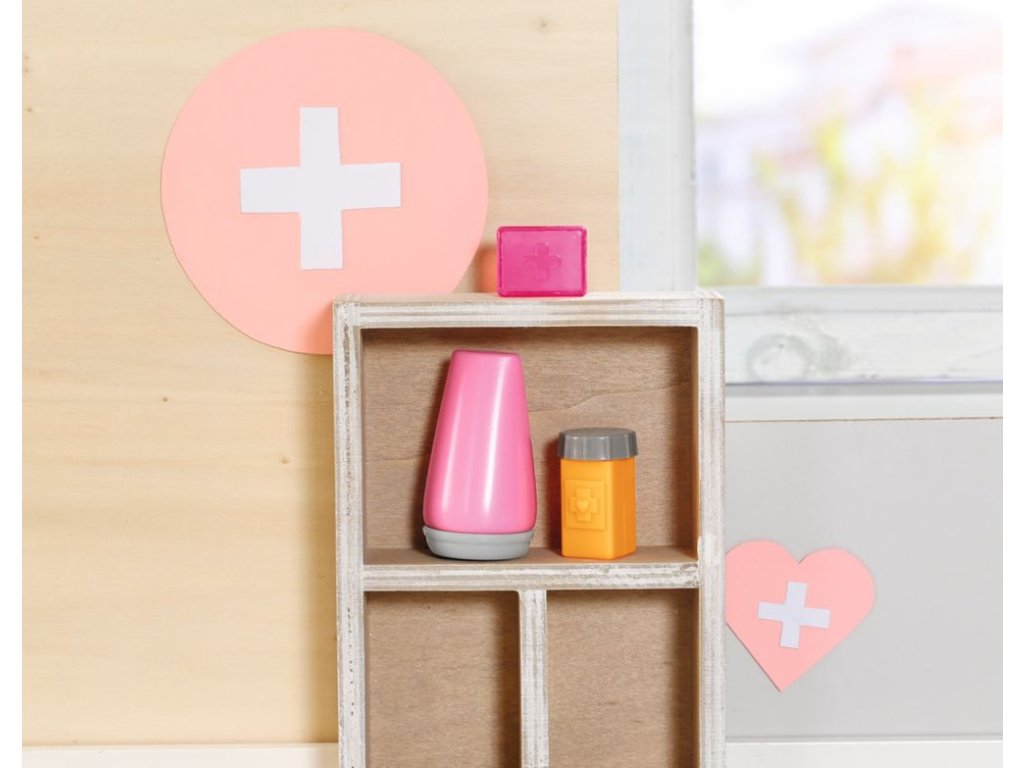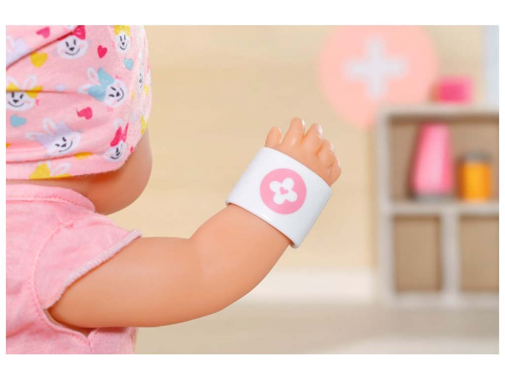 Zcela profesionálně jako opravdový záchranář si hned nasazuje růžovou roušku. Pak z tašky vytáhne vše, co potřebuje k ošetření rozbitého kolene panenky BABY born. Tubu s mastí a obvaz, který nůžkami ještě trochu upraví. Jakmile BABY born spatří krabičku s léky a lžičku s medicínou, vykulí oči. Léky ale zatím naštěstí nepotřebuje. Bratříček záchranář chce raději ještě změřit teplotu. Malá kaskadérka ji má z rozrušení trochu zvýšenou. Třeba by se ohřívací láhev mohla změnit na chladicí polštářek. Poté bratříček všech 9 zdravotních pomůcek schová zpět do látkového sáčku, který zdobí obrázek zdravotní kačenky Berty.