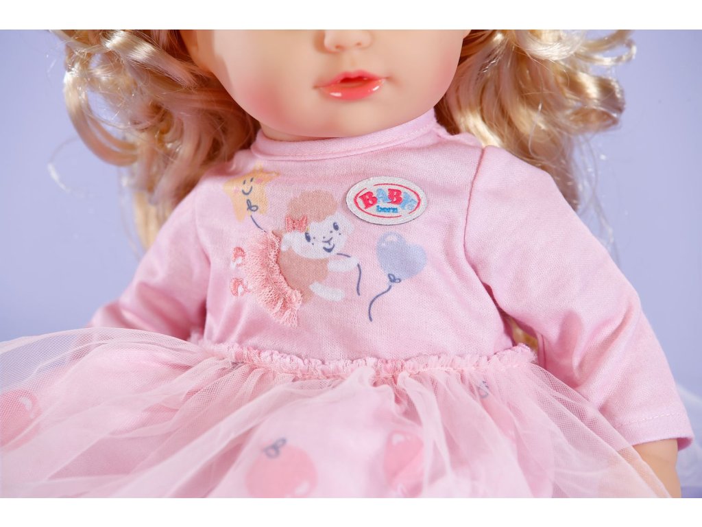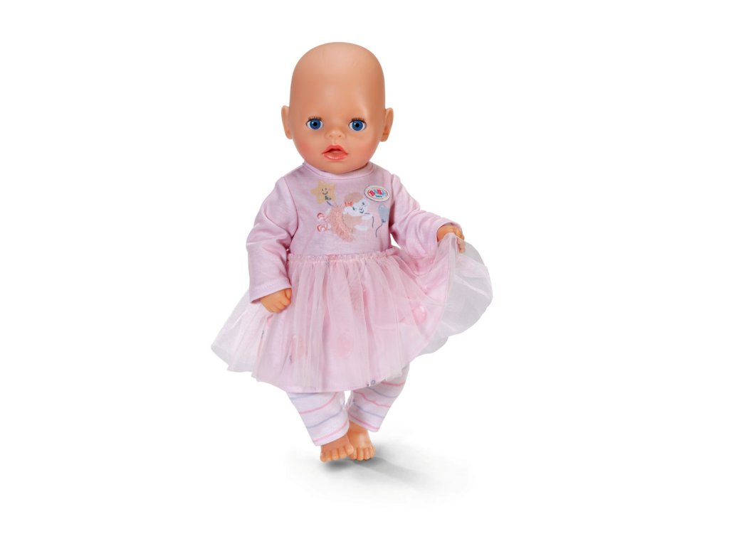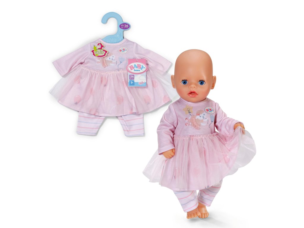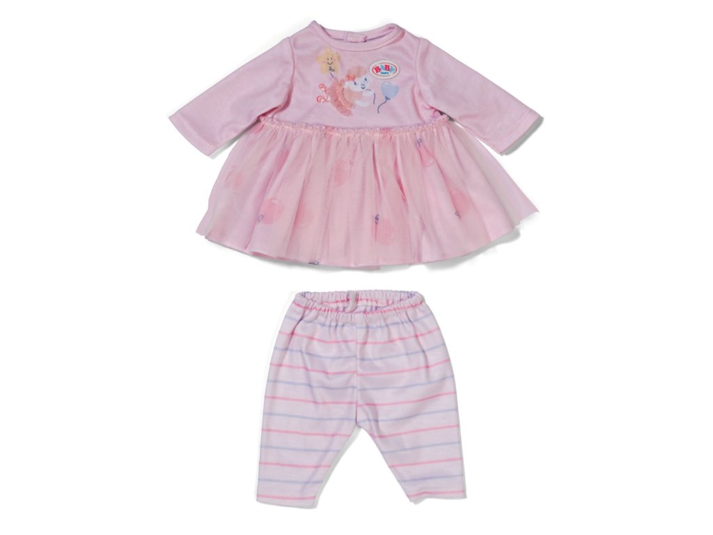 Tento outfit pro panenky ve světle růžové barvě dodává eleganci každé panence velikosti 36 cm. Šaty s dlouhými rukávy a tylovou sukní působí obzvlášť hravě, zatímco pruhované legíny dodávají outfitu ležérní nádech. Pastelové barvy krásně podtrhují celý outfit.