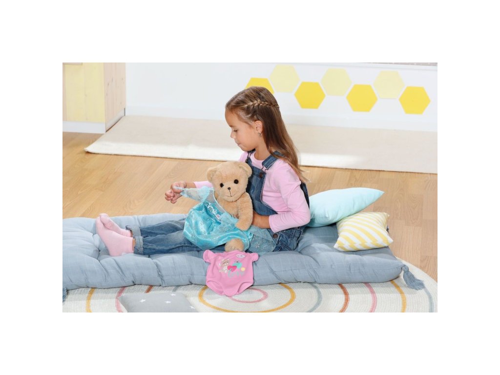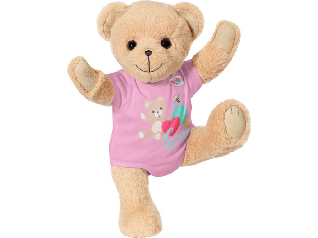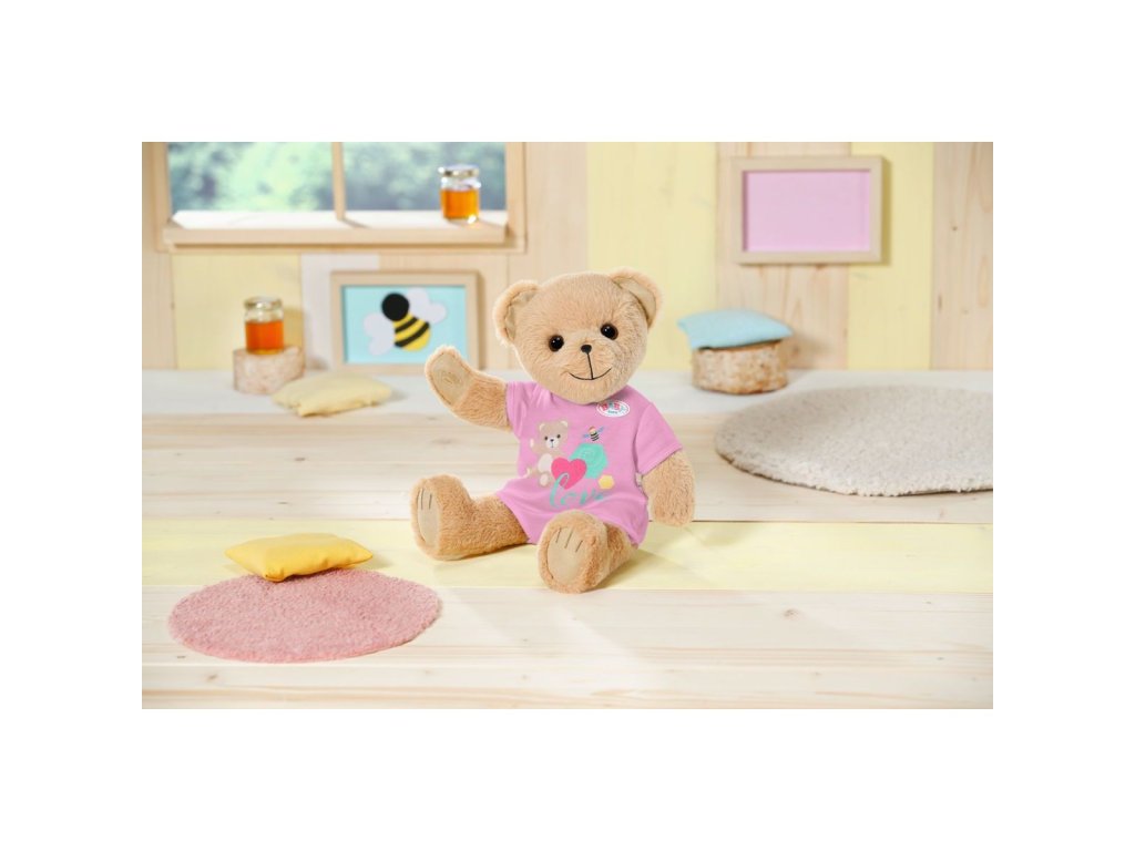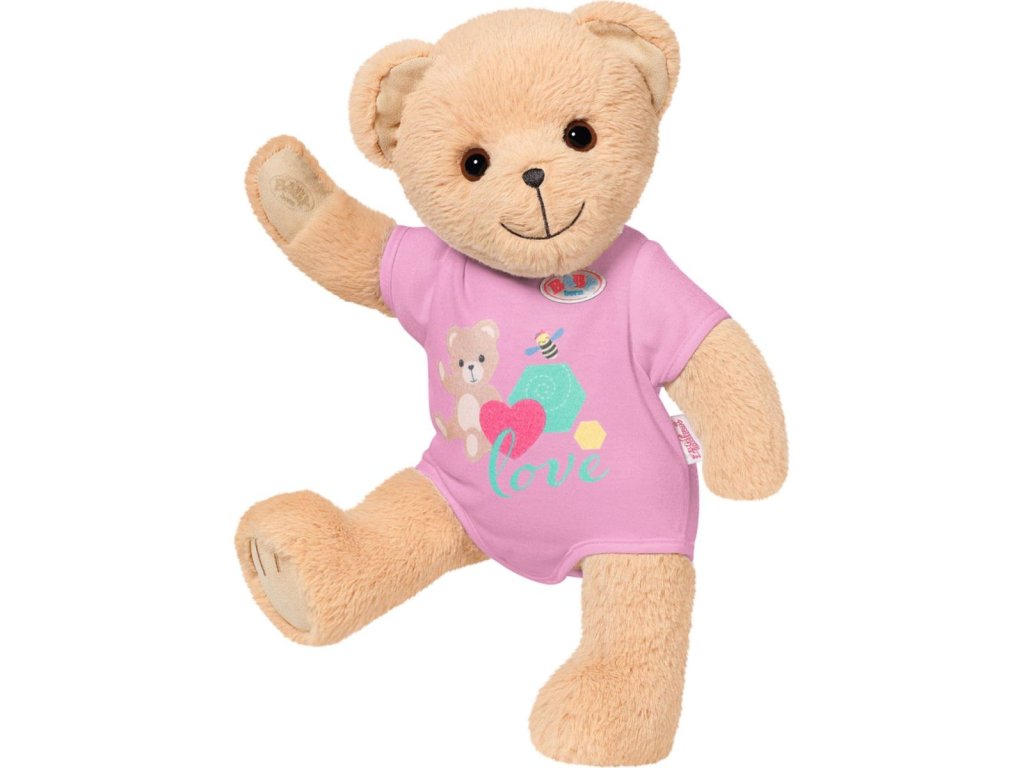 Malý medvídek se sladkým úsměvem má měkké tělíčko. Je oblečen do slušivého růžového oblečku. Má svou vlastní módní kolekci a medvědí doplňky, ale může nosit i téměř cokoliv, co nosí panenka BABY born. Může používat i její doplňky. Medvídek je navržen tak, aby mu sedělo téměř všechno oblečení pro BABY born velikosti 43 cm. Jen její botičky neobuje. Ale který medvídek by potřeboval botičky? Díky pohyblivým ručičkám a nožičkám a otáčecí hlavičce ho lze snadno převlékat. Je velmi pohyblivý, a proto je skvělým společníkem pro hraní různých her. Kdo jako první něco napíše do knížky přátelství? Součástí knížky přátelství je i arch samolepek.