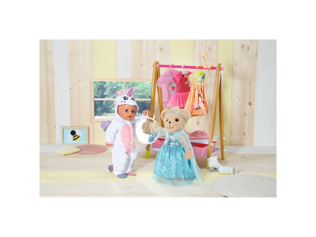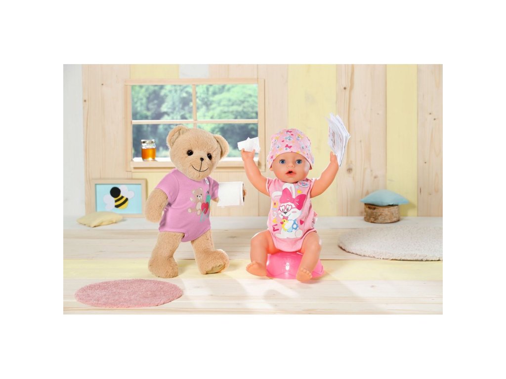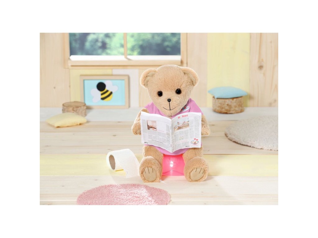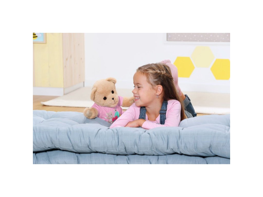 Malý medvídek se sladkým úsměvem má měkké tělíčko. Je oblečen do slušivého růžového oblečku. Má svou vlastní módní kolekci a medvědí doplňky, ale může nosit i téměř cokoliv, co nosí panenka BABY born. Může používat i její doplňky. Medvídek je navržen tak, aby mu sedělo téměř všechno oblečení pro BABY born velikosti 43 cm. Jen její botičky neobuje. Ale který medvídek by potřeboval botičky? Díky pohyblivým ručičkám a nožičkám a otáčecí hlavičce ho lze snadno převlékat. Je velmi pohyblivý, a proto je skvělým společníkem pro hraní různých her. Kdo jako první něco napíše do knížky přátelství? Součástí knížky přátelství je i arch samolepek.