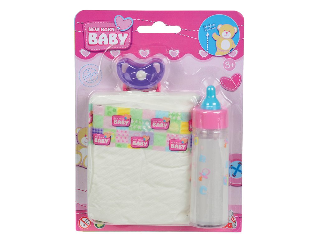 Sada pro miminka z řady New Born Baby obsahuje dudlík, plenu a lahvičku s mlékem (mizející efekt při pití). Vhodné pro panenky velikosti 38 - 43 cm.