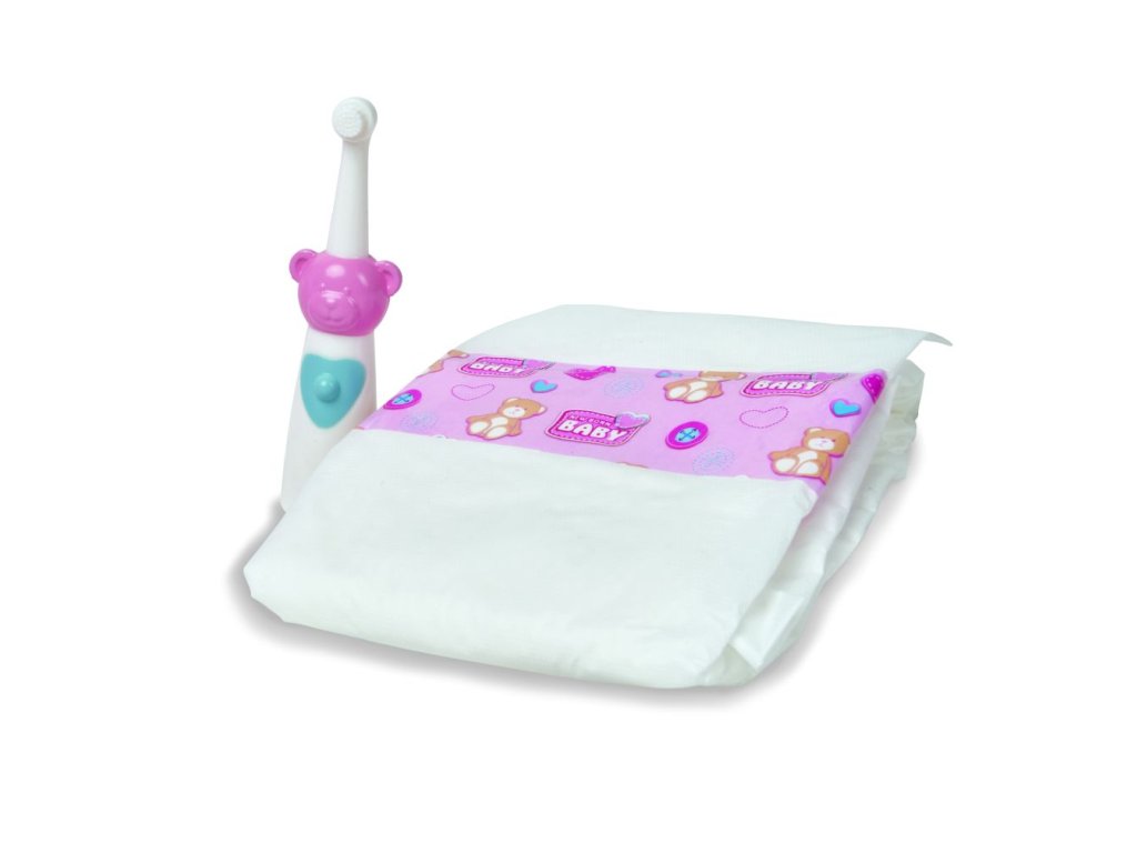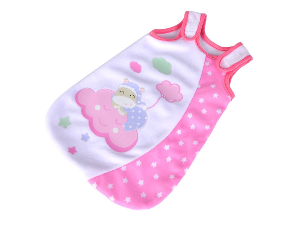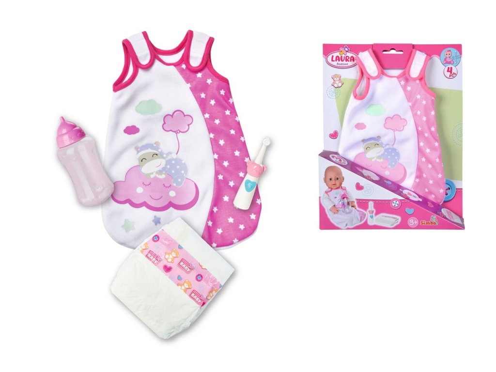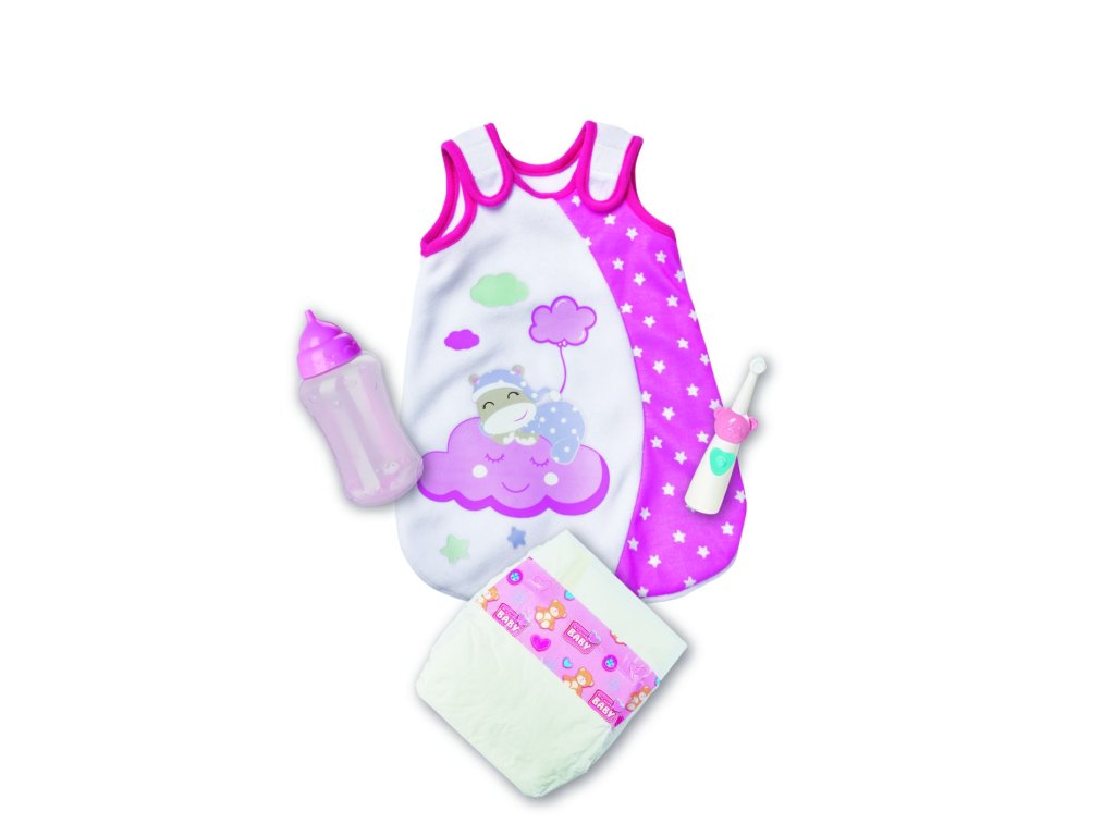 Sada na spaní obsahuje spací pytel, zubní kartáček, plenku a lahvičku pro panenky o velikosti 30-38 cm.