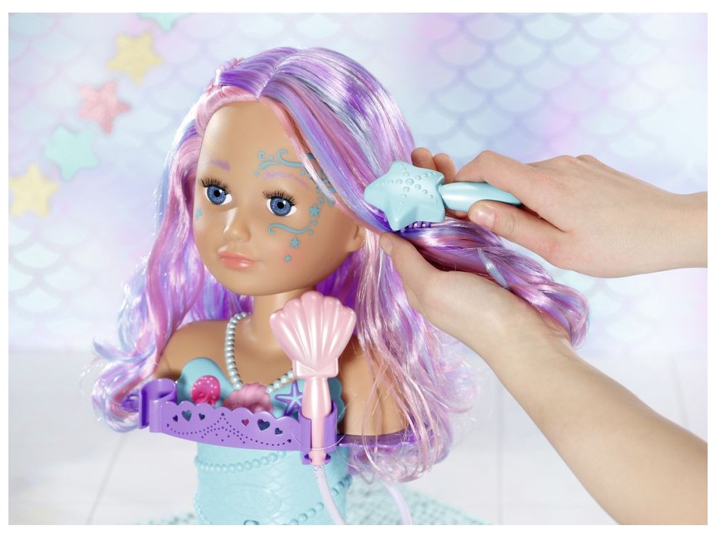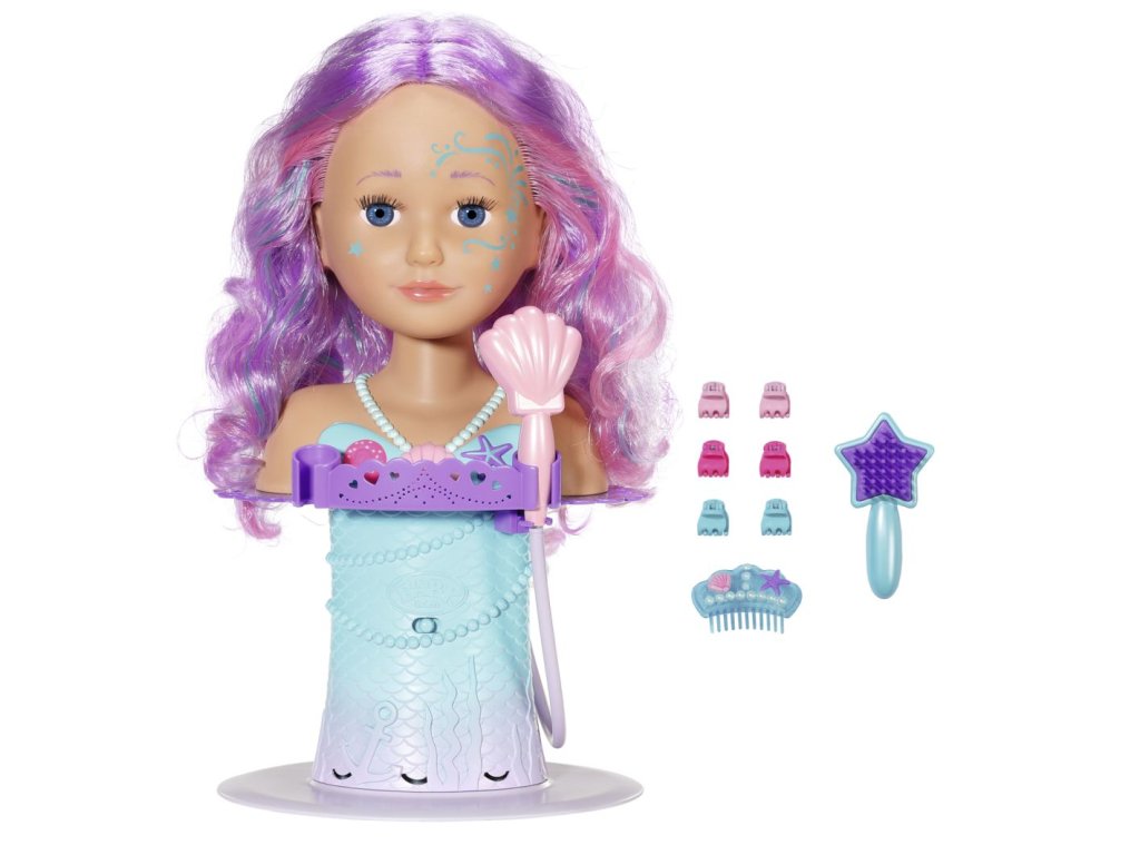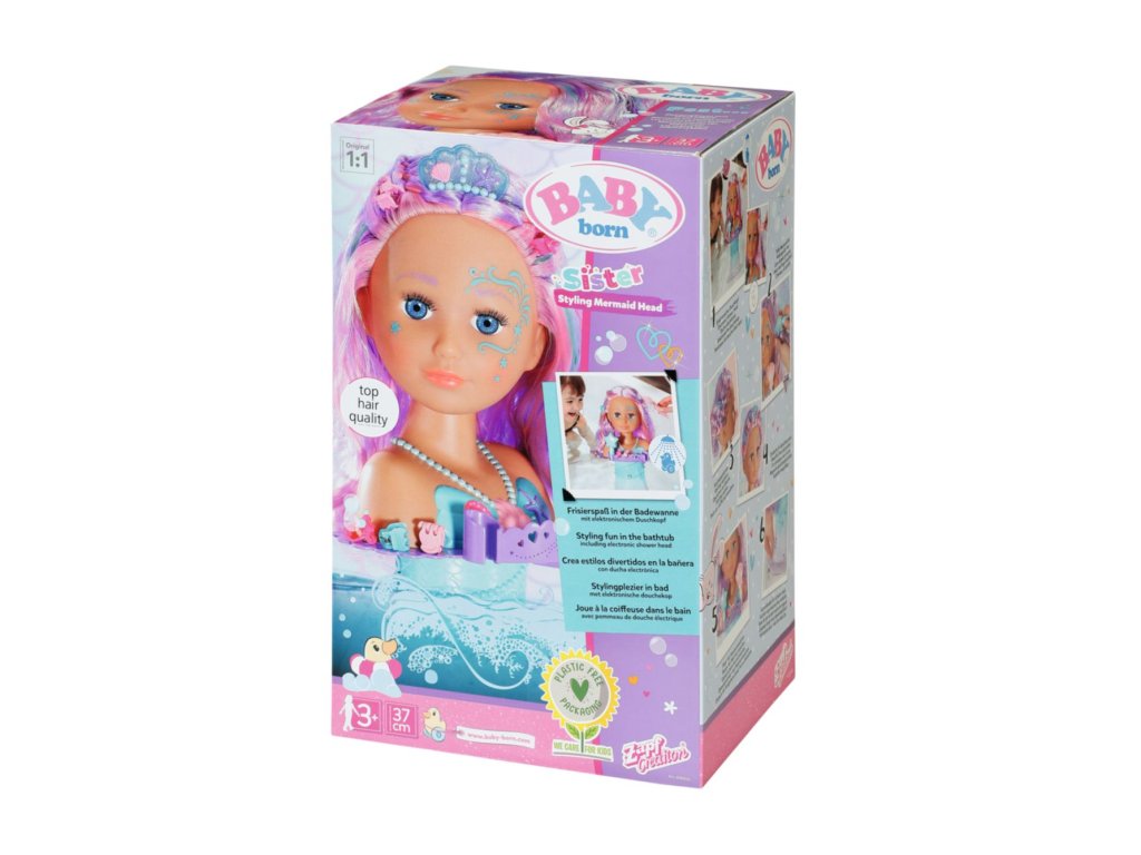 Starší sestřička BABY born Česací hlava Mořská víla s elektronickou sprchou. Součástí je kartáč, čelenka a 6 sponek do vlasů.