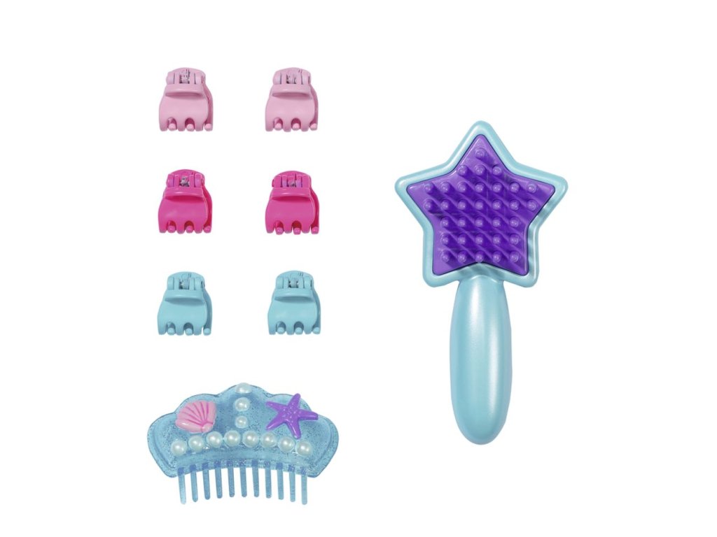 Barevné vlasy s barevnými pramínky jsou velmi kvalitní a lze je upravovat do stále nových účesů. Vlasy můžeš ozdobit šesti sponkami a hřebínkem ve tvaru čelenky. Ve spodní části hlavy se nachází odkládací plocha na všechny vlasové doplňky a také úchyty na kartáč ve tvaru hvězdice a na sprchovou hlavici. Po vyjmutí sprchové hlavice ve tvaru mušle z držáku se spustí čerpadlo a teče voda. Ale pouze tehdy, když se česací hlava skutečně nachází ve vodě.