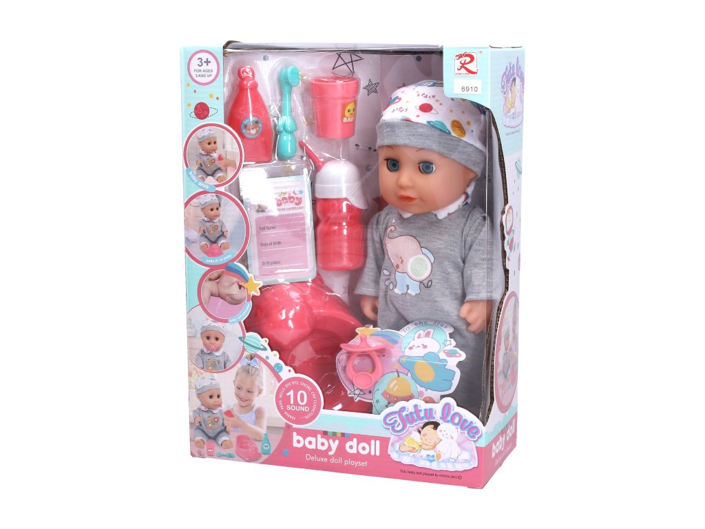 Miminko čurající. Velikost 30cm. Miminko pije z lahvičky, čurá, vydává zvuky. Obsahuje: panenku, dudlík, nočník, lahvičku, kelímek, kartáček, rodný list, pastu na zuby. 3xAG13 baterie součástí balení.