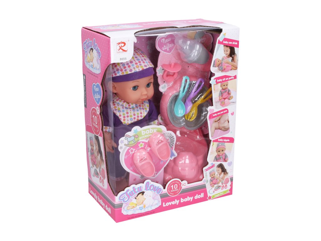 Miminko čurající. Velikost 30cm. Miminko pije z lahvičky, čurá, zavírá oči při položení na záda. Obsahuje panenku, nočník, talířek, příbor, lahvičku, dudlík. Vydává zvuky. 3xAG13 baterie součástí balení.