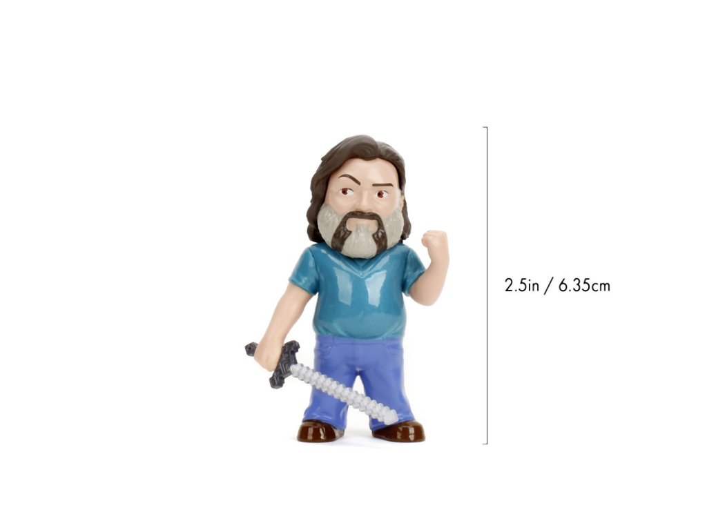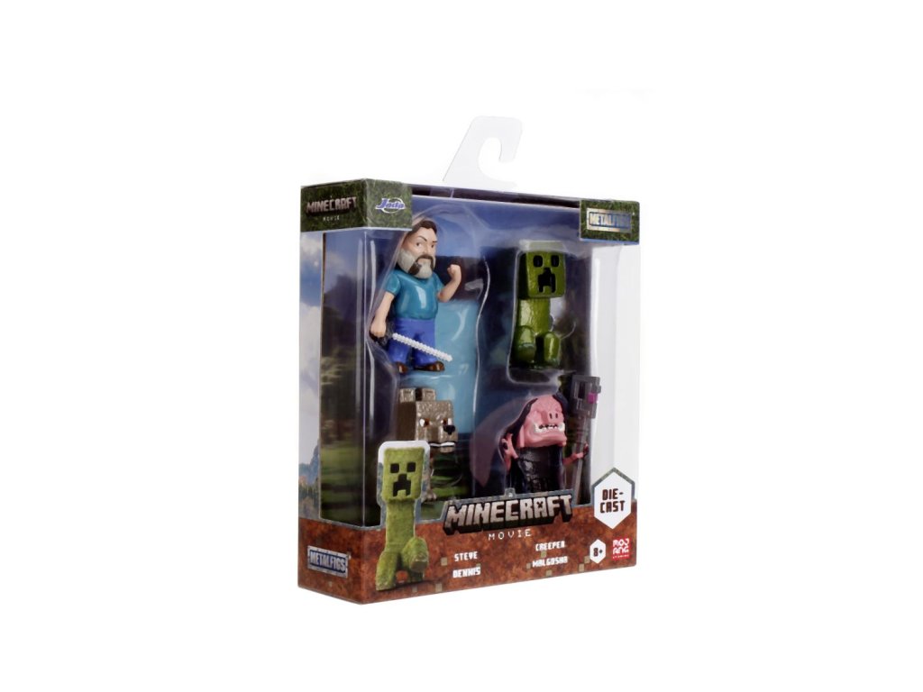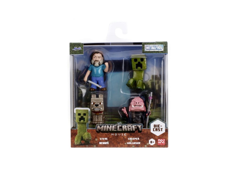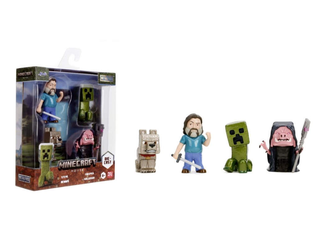 Sada 4 kovových figurek Minecraft Movie o velikosti cca 6,5 cm. Postavy: Steve, Wolf, Creeper, Malgosha.