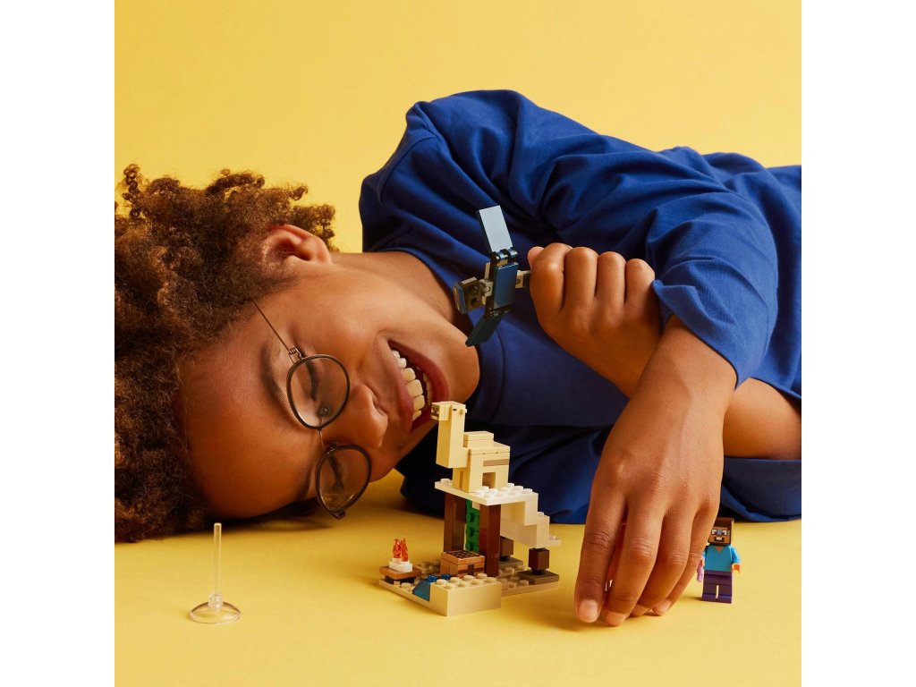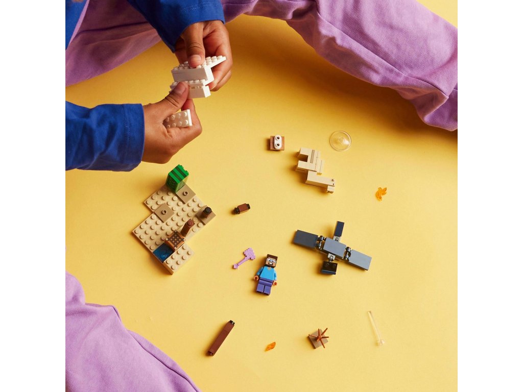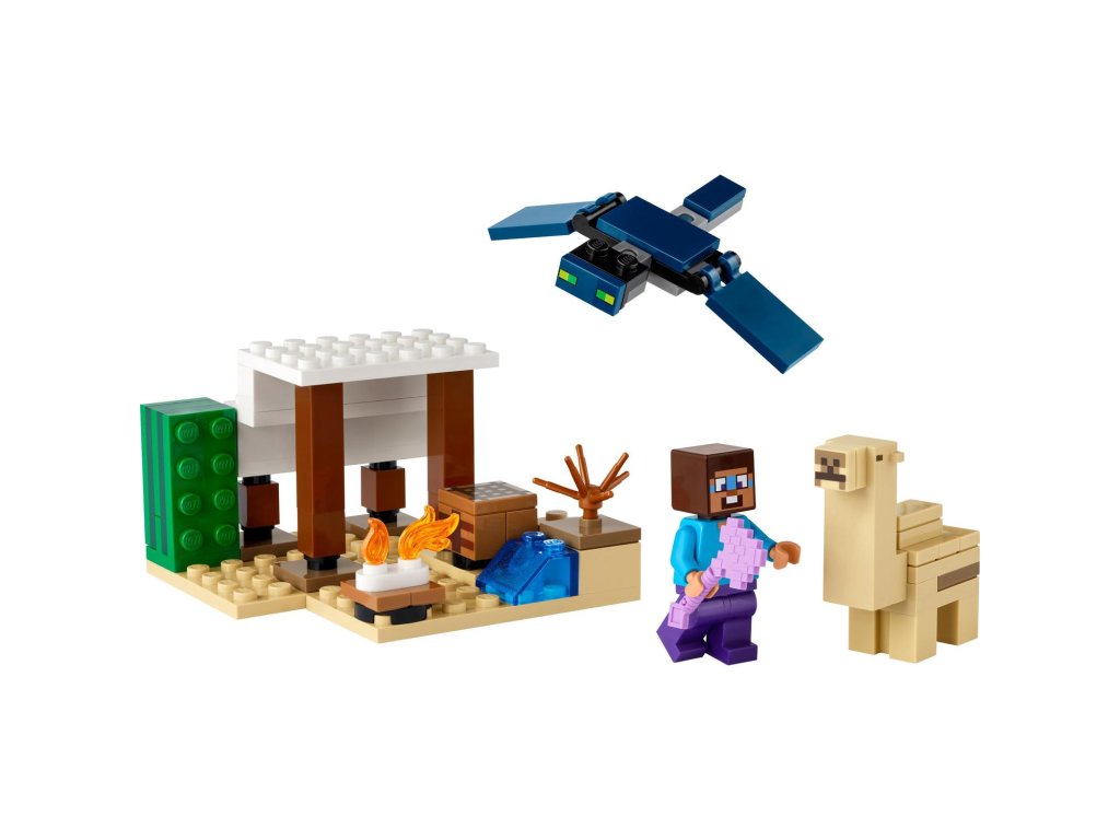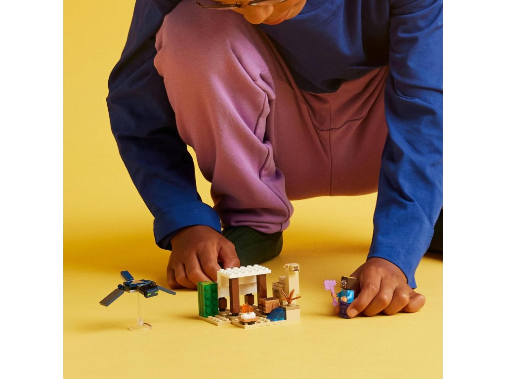 V této přestavitelné herní stavebnici pro děti od 6 let najdete 3 figurky LEGO Minecraft, včetně Stevea, a domek v poušti. Součástí sady jsou také proslulé prvky ze hry Minecraft, jako je pracovní stůl, táborák a řada dílků pro sestavení pouště. Jedná se o skvělý dárek pro fanoušky Minecraftu, který přímo vyzývá k tvořivým dobrodružstvím a akčním bitvám, když základnu napadne létající Přízrak s pohyblivými křídly. Zcela poprvé se ve stavebnici LEGO Minecraft objevuje mládě velblouda a nechybí ani nová verze Steveovy tváře. Sadu lze kombinovat s dalšími stavebnicemi z řady LEGO Minecraft (prodávají se samostatně) a představuje skvělý dárek pro děti i milovníky videoher.