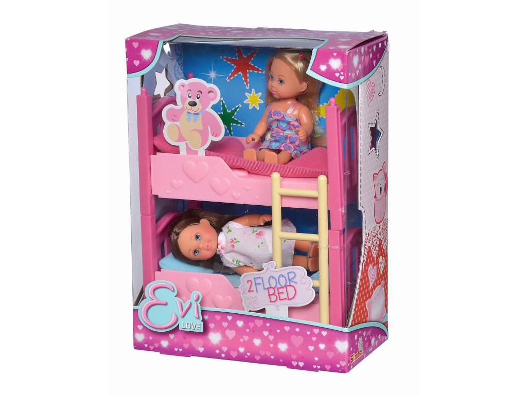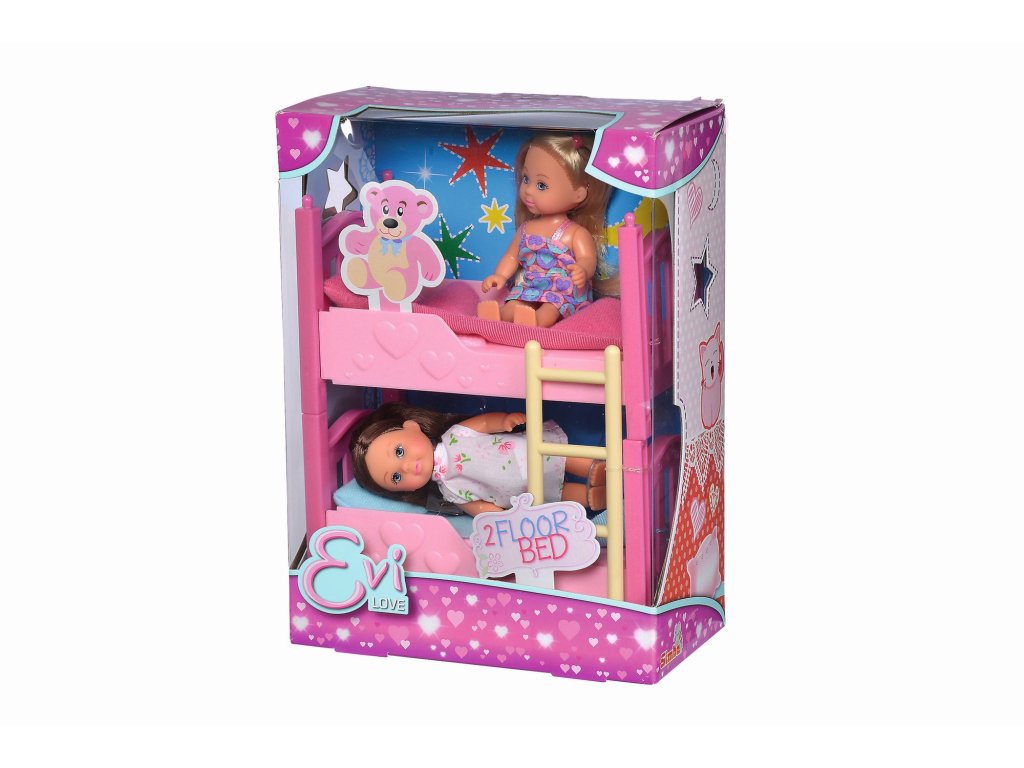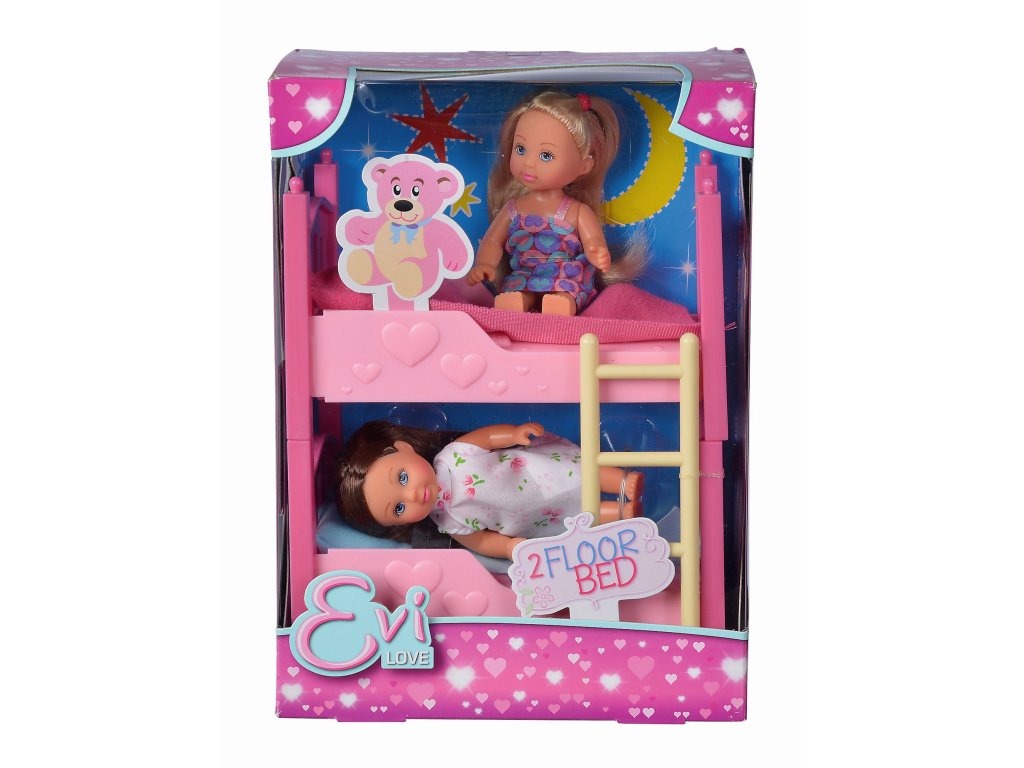 Panenky Evičky v pyžamu s palandou. Palanda lze rozložit na dvě postýlky. Součástí 2 polštáře a 2 deky. Výška panenky 12 cm.