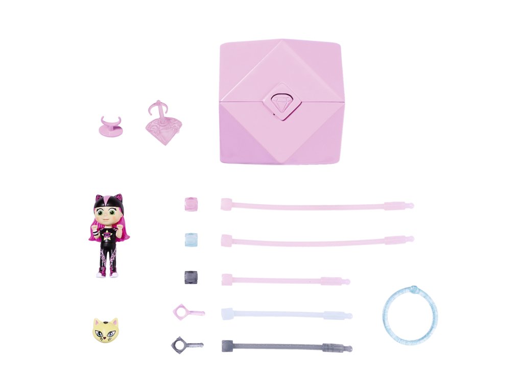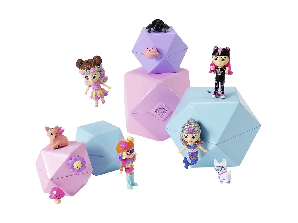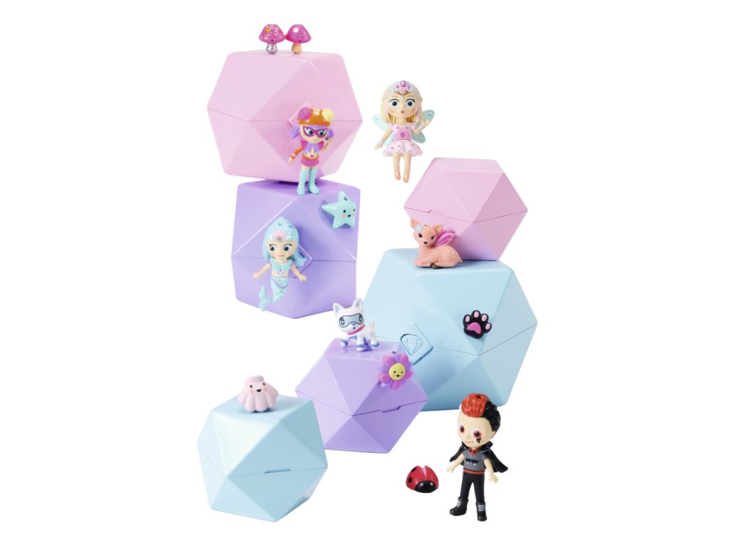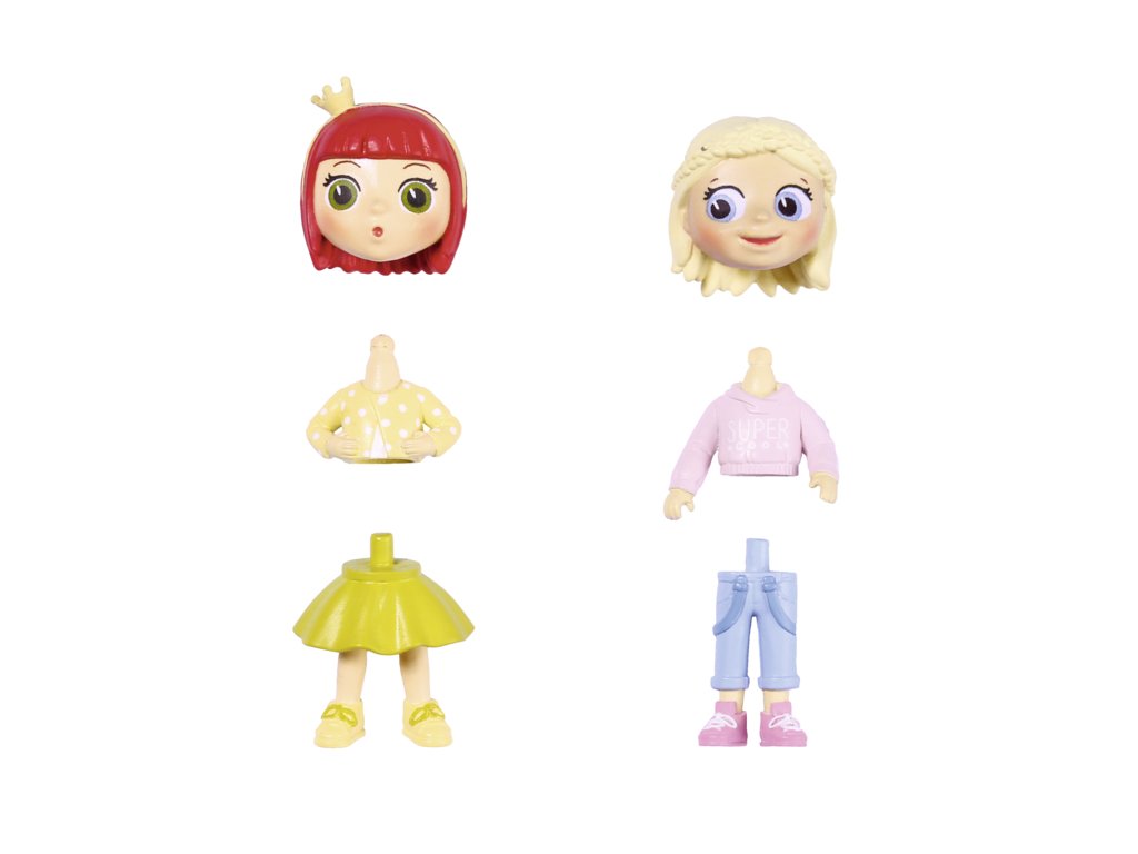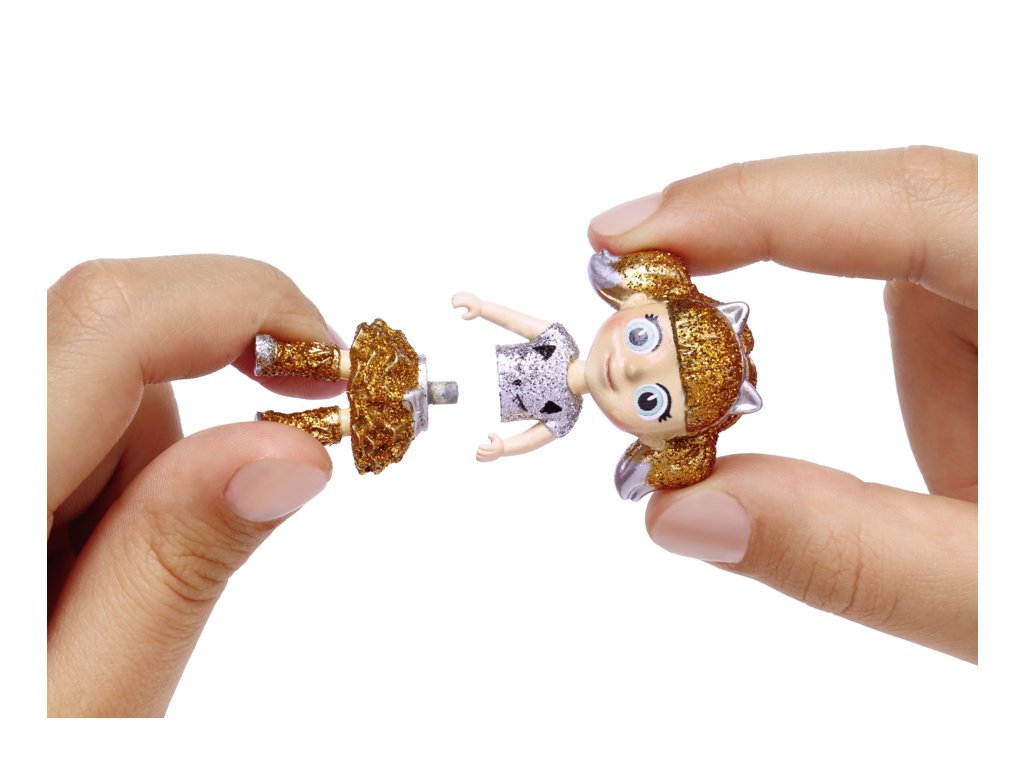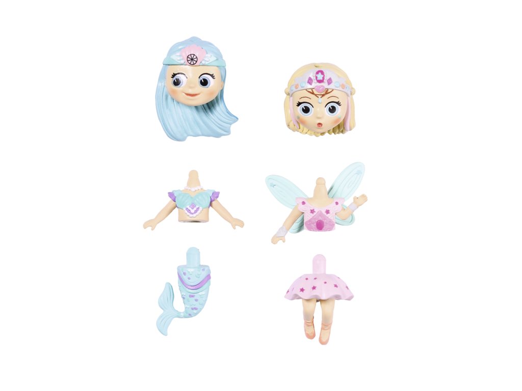 Vyměňuj panenkám hlavu, trup a nohy a vytvoř tak úplně novou postavičku. Hlavička s vlásky ozdobenými kytičkovou čelenkou, tělo s upířím pláštíkem a k tomu třpytivá sukýnka. Nebo! Hlava s korunkou, tělo s tričkem s křidélky a k tomu ploutev mořské panny. Zacvakni jednotlivé části panenky do sebe a ukaž tak, jakou máš právě náladu! Existuje více než 100.000 různých kombinací. Někde je schovaná i vzácná třpytivá panenka!