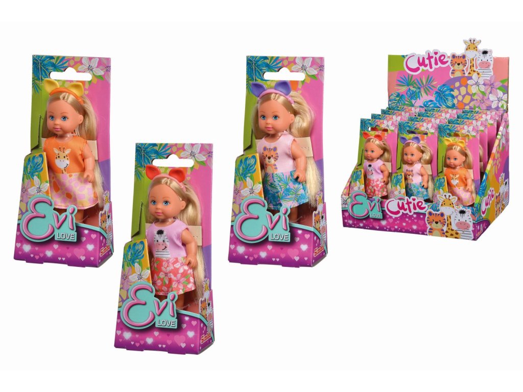 Panenka Evička v oblečku se zvířátkem a s čelenkou s ouškama. Výška panenky 12 cm. 3 různé oblečky. Displej 12 ks.