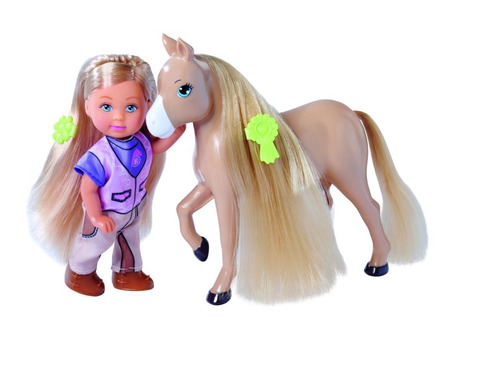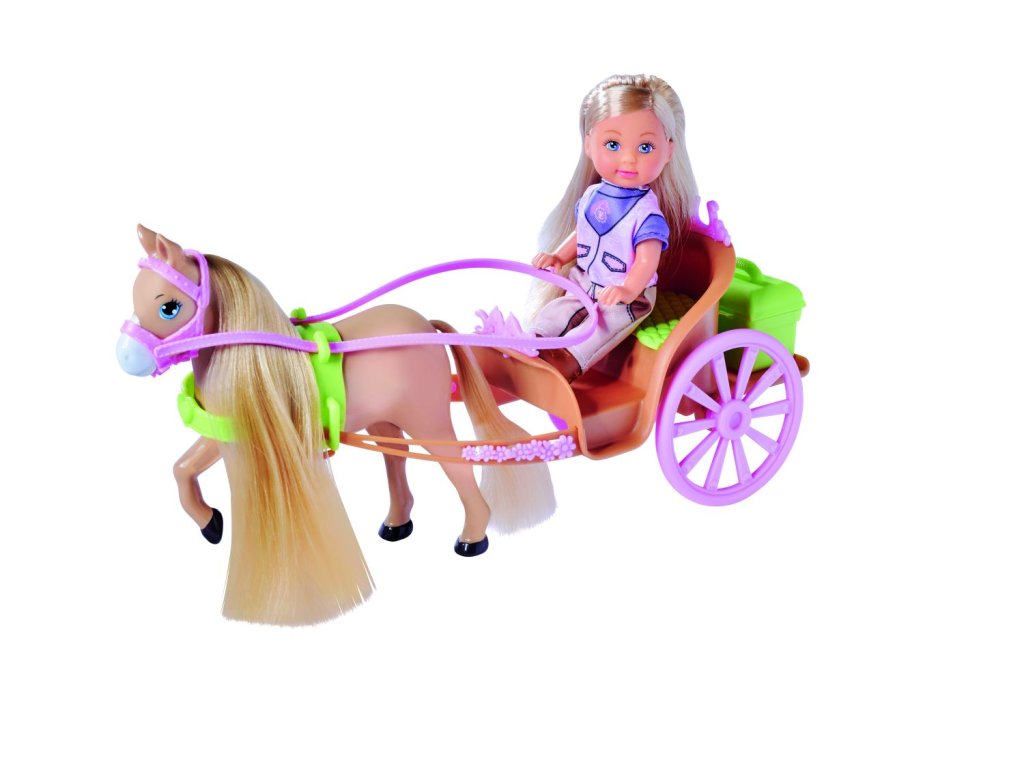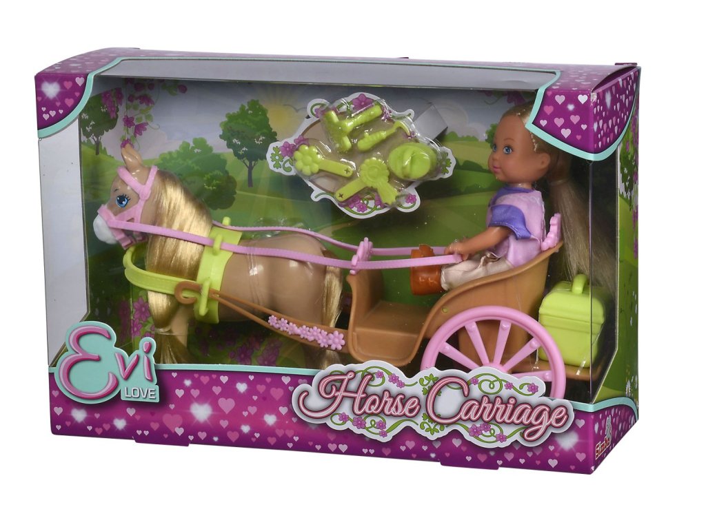 Panenka Evička s kočárem taženým jedním koněm, tajná přihrádka a příslušenství součástí. Délka povozu 28 cm. Výška panenky 12 cm.