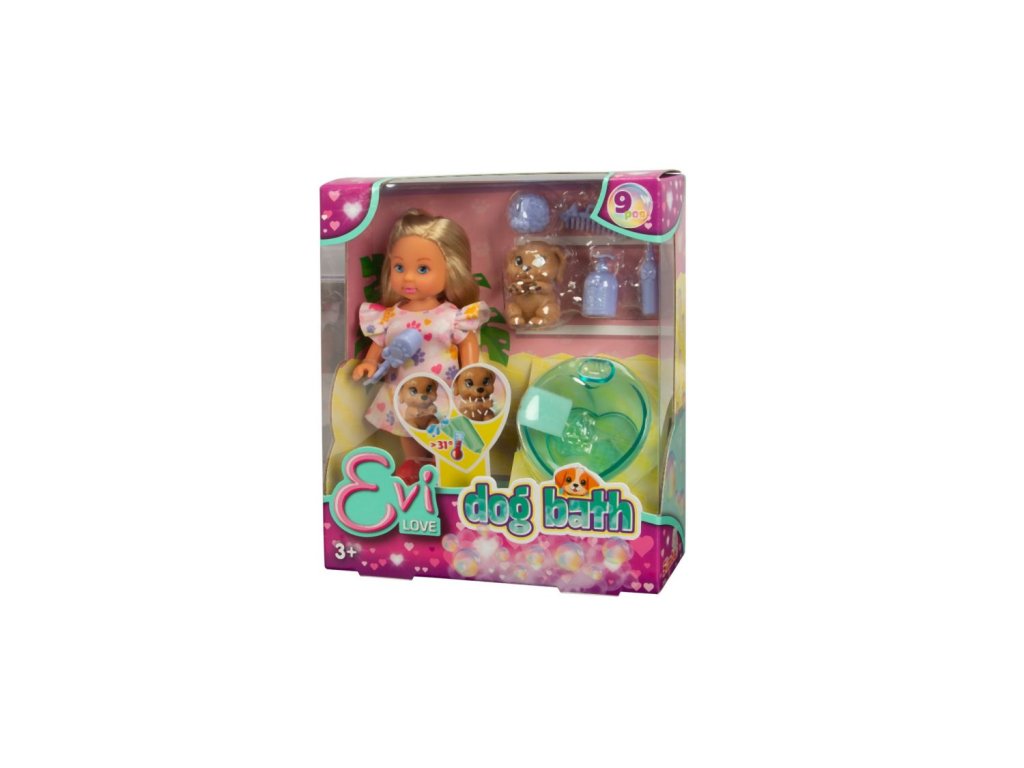 Panenka Evička s pejskem, který má špinavé pacičky. Součástí balení je celkem 8 doplňků, např. vana a ručník. Velikost panenky 12 cm.
