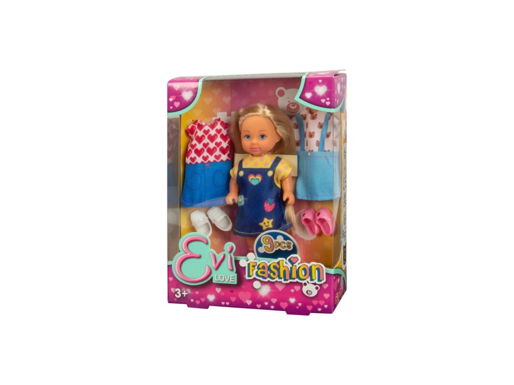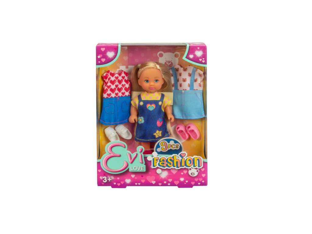 Panenka Evička oblečená v roztomilých džínových šatech. Součástí balení jsou další dva outfity s teniskama. Velikost panenky 12cm.