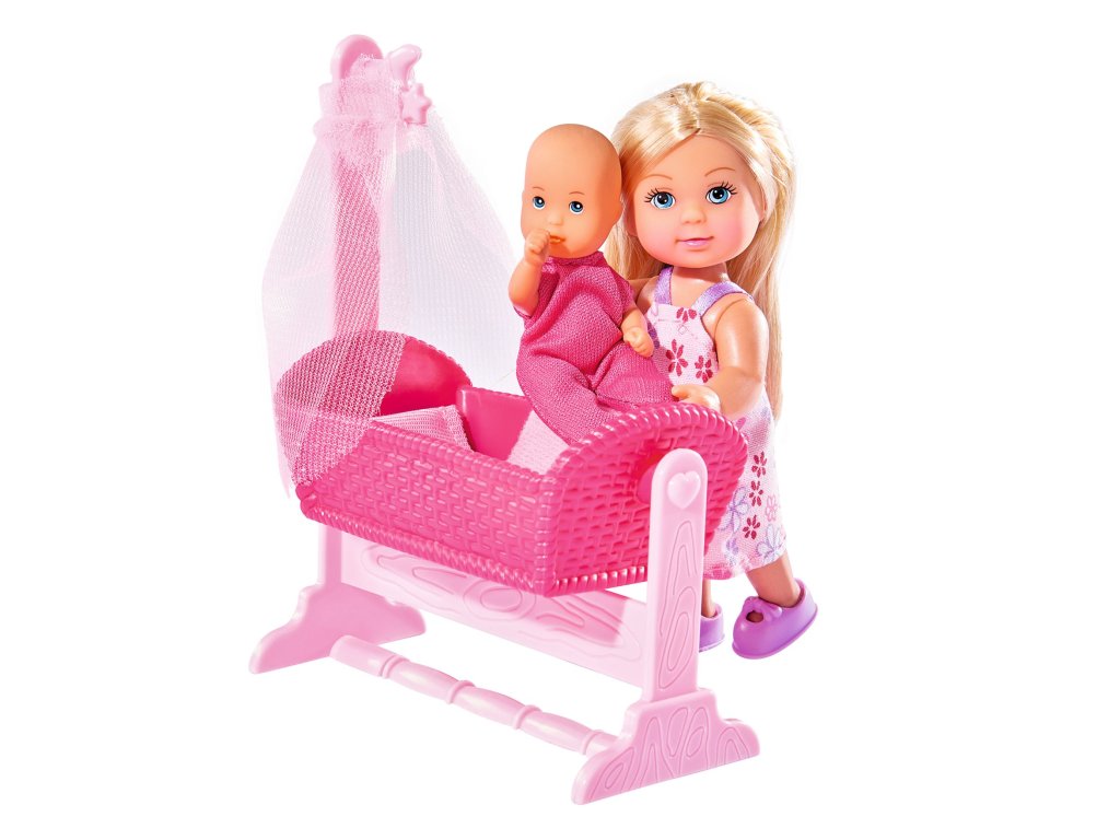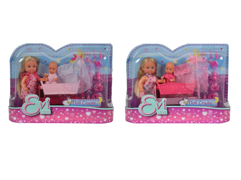 Panenka Evička s miminkem v kolébce a příslušenství, 2 druhy. Velikost panenky 12 cm a velikost miminka 5 cm.
