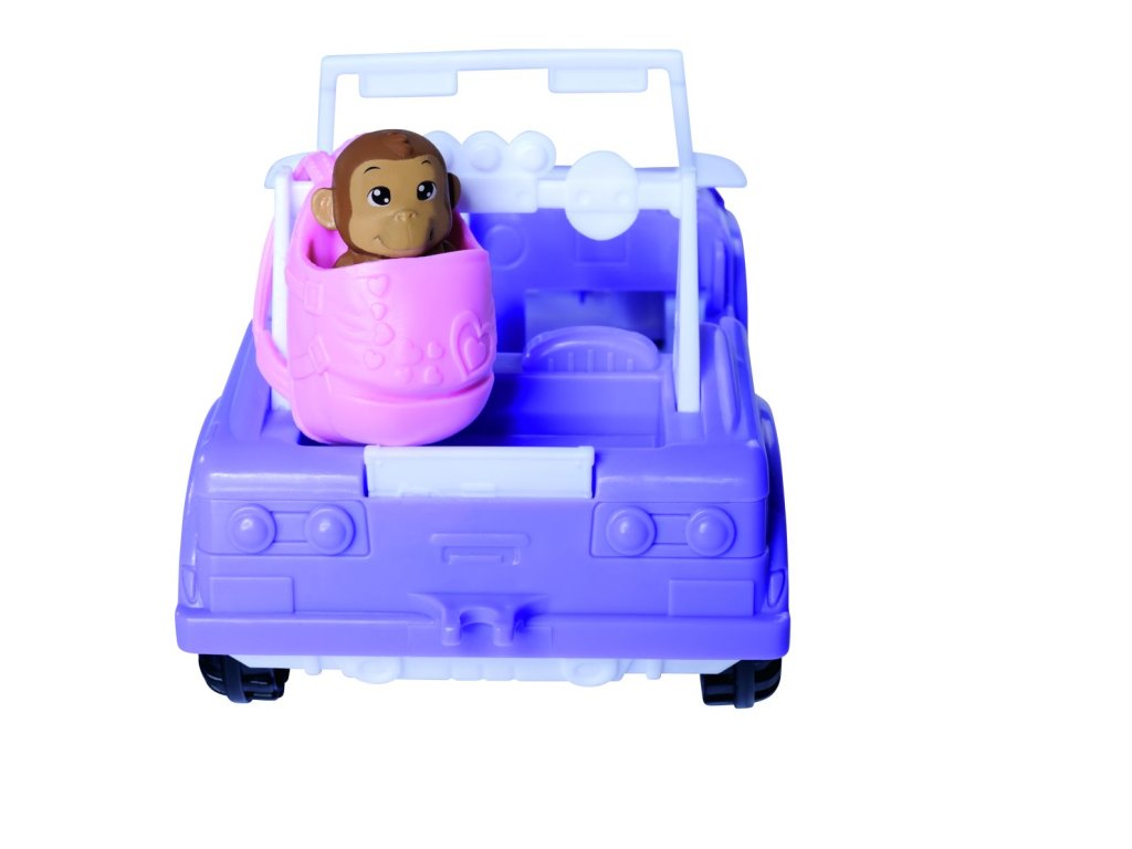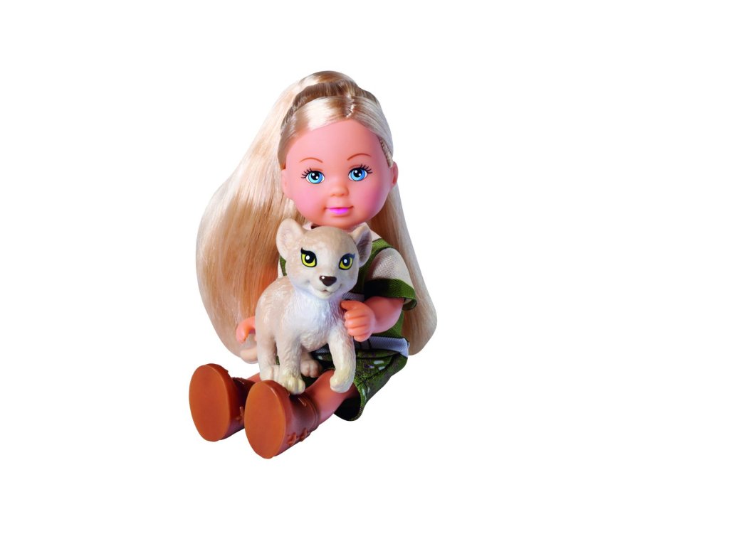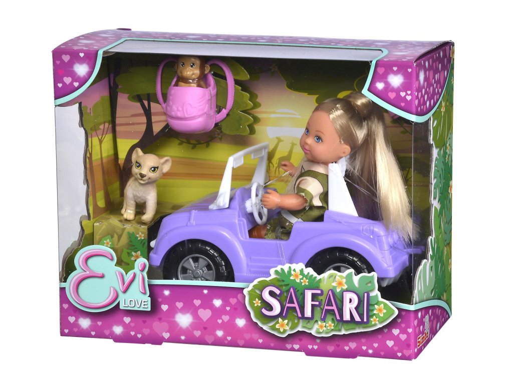 Panenka Evička v safari oblečení a s terénním autem. Nechybí batůžek, malá opička, lvíček a dalekohled. Délka auta 16 cm. Výška panenky 12 cm.
