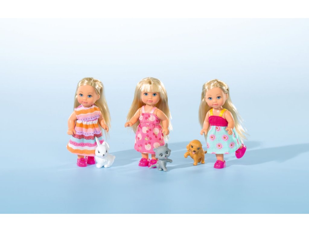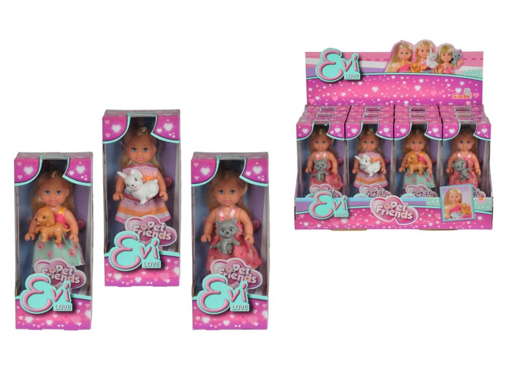Panenka Evička má svého zvířecího mazlíčka. 3 druhy zvířátek: králíček, pejsek nebo kočička. Výška panenky 12 cm.