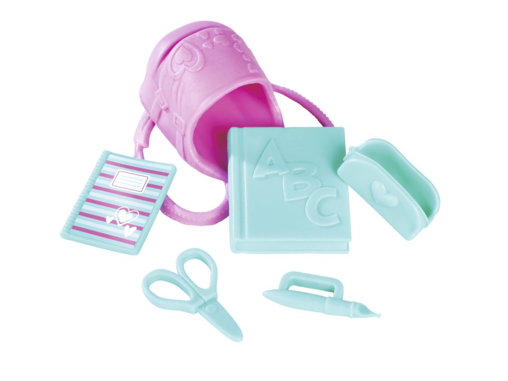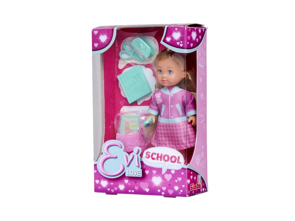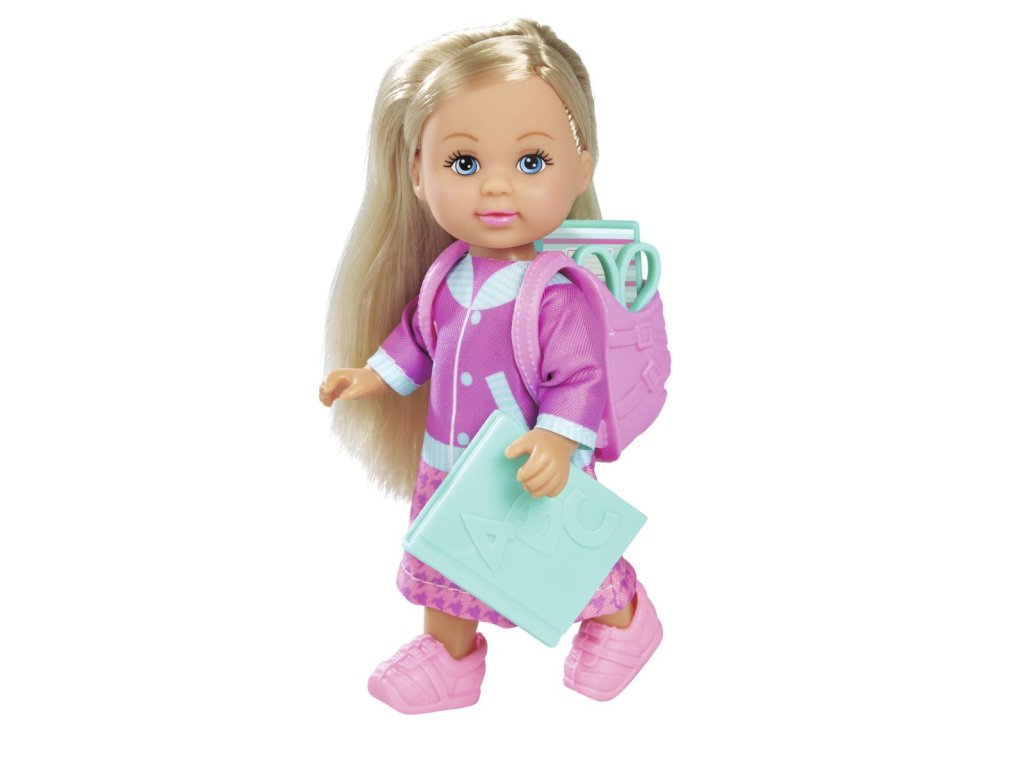 Panenka Evička a doplňky do školy - sešit, aktovka, penál, pero, nůžky, učebnice. Velikost panenky 12 cm.